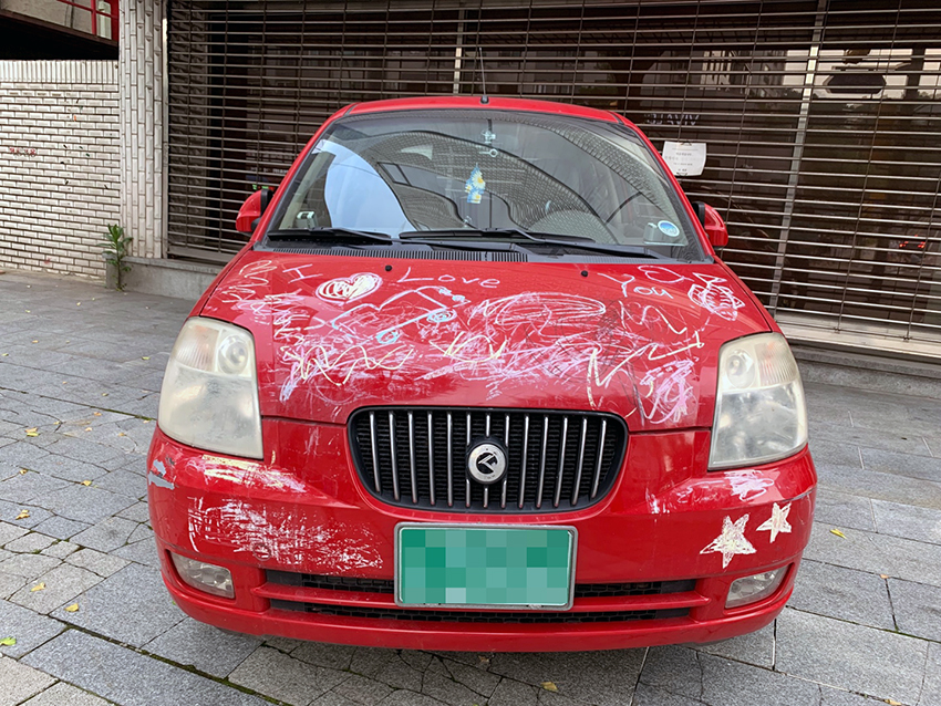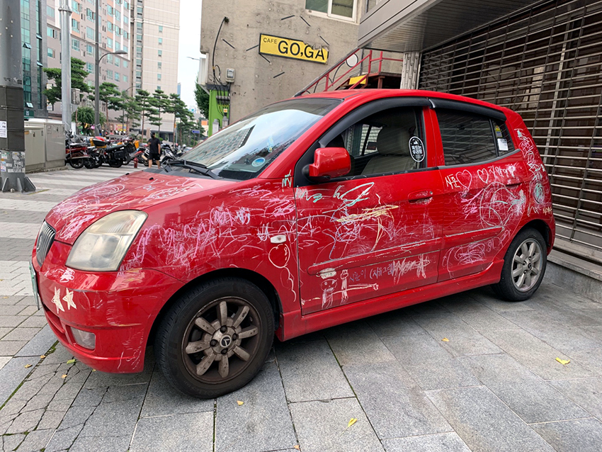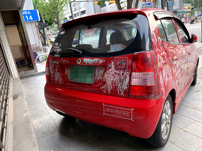 처음엔 버려진 차인 줄 알았는데, 자동차에 그려진 글씨들을 보니