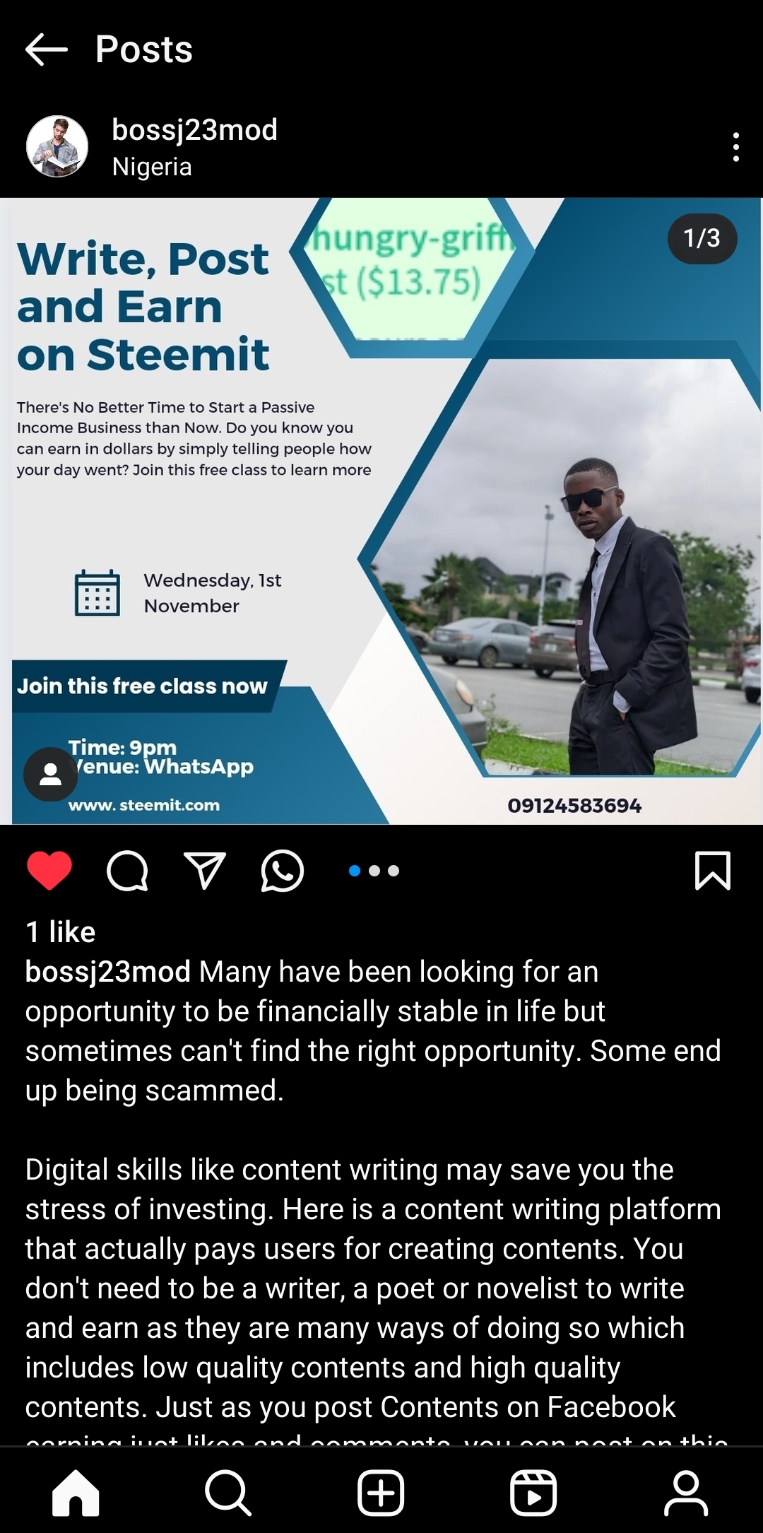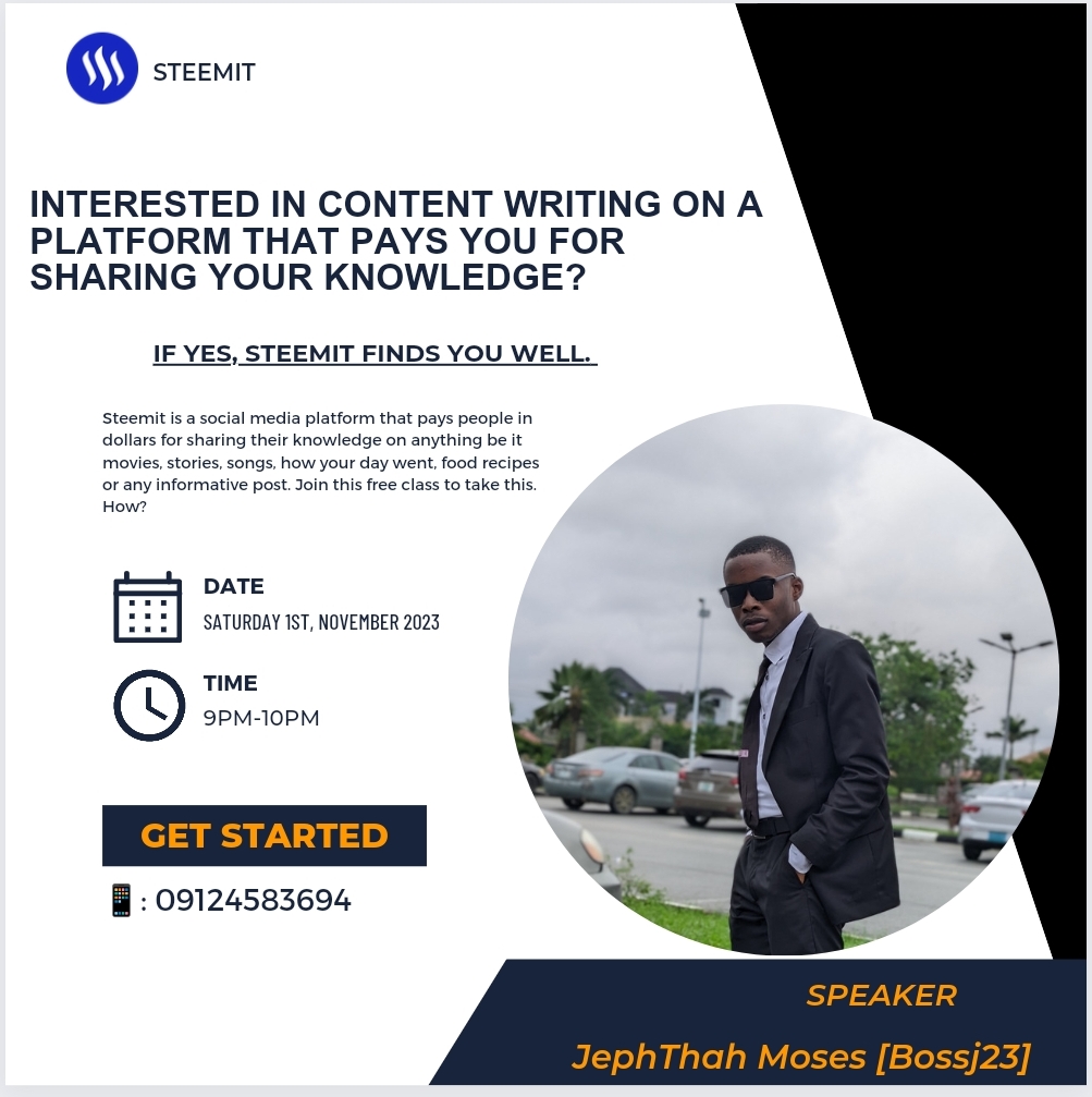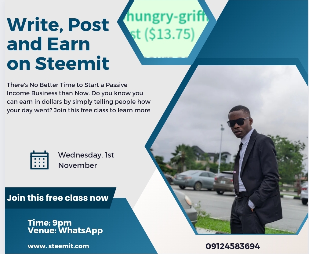 | A captivating text to intrigue and make them want to know more | Many have been looking for an opportunity to be financially stable in life but sometimes can't find the right opportunity. Some end up being scammed. Digital skills like content writing may save you the stress of investing. Here is a content writing platform that actually pays users for creating contents. You don't need to be a writer, a poet or novelist to write and earn as they are many ways of doing so which includes low quality contents and high quality contents. Just as you post Contents on Facebook earning just likes and comments, you can post on this platform too and get paid for the knowledge you shared. What can you write on this platform? You can share how your day went and earn. You can create posts on food, movies, songs, crypto and anything at all. What do you stand to earn? You stand the chance to get cryptocurrencies of which you can sell them for cash. These cryptocurrencies include, trons and steem. Do you need to invest? No.. What is the platform called? STEEMIT. I'll be hosting a free class on WhatsApp social media on the 1st of November by 9pm to tell you more and attain to questions you may bring about this platform. Interested persons should click on the link below to join the free class. https://wa.me/message/QRSRMEDMPCGDD1 |