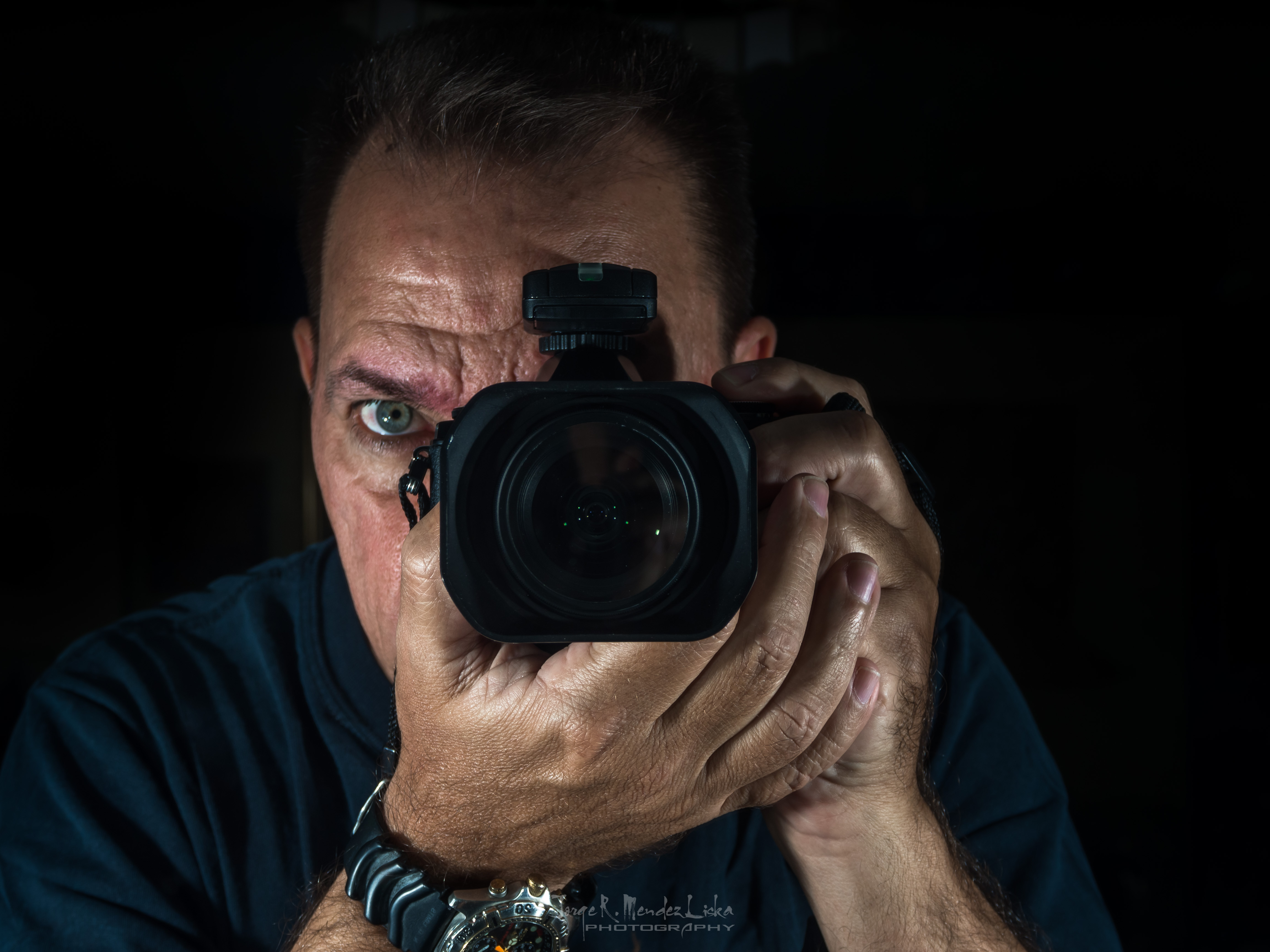 I created this image by combining two selfies I made, the left side is a self-portrait shot against a mirror with a very narrow f-stop to darken all the background and two speedlights one on each side.