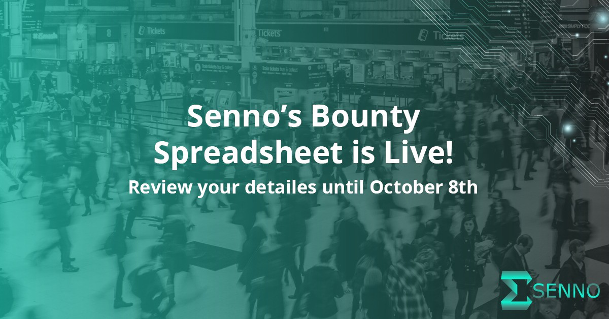 We will lock the bounty spreadsheet on October 8th. Any submissions received after this date will be ignored, so don’t waste your time! Check your entries now and secure your Senno tokens!