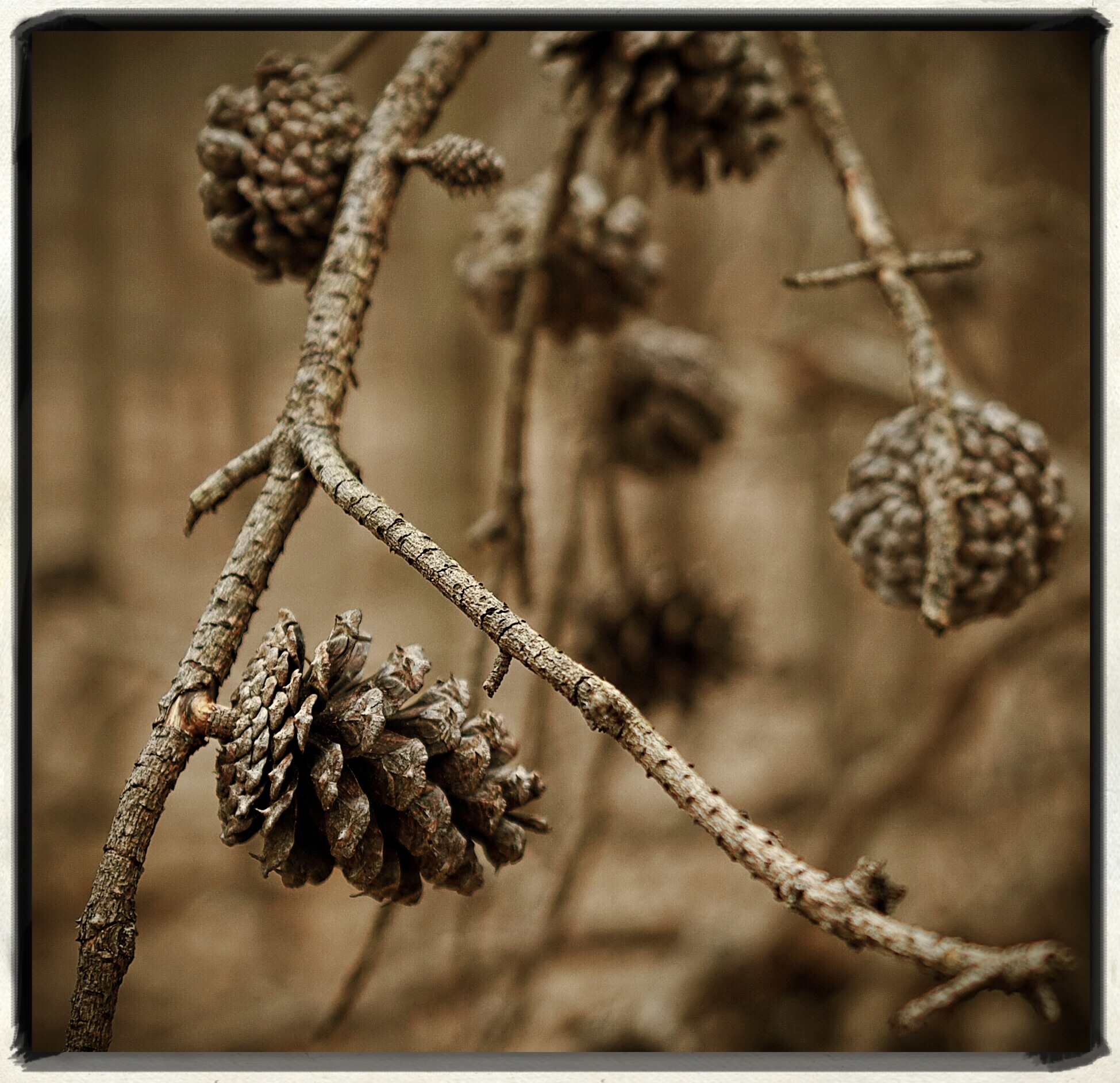This dead branch of pine cones seemed perfect for sepia Saturday. I used the app Phototoaster to add their Super Sepia preset to the shot, but to be honest, it didn’t change that much.