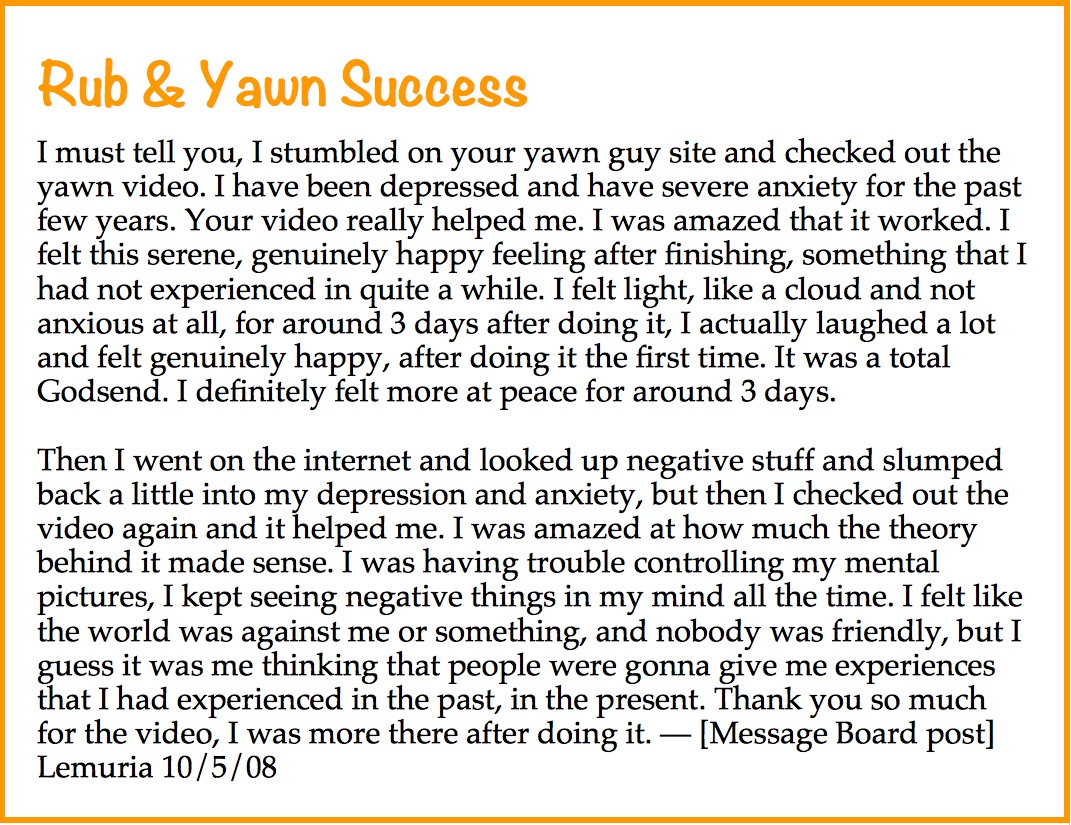 Yawnguy YouTube videos: Entry level. Since 2007, I deliver sessions directly to you by video on your custom topics. Start with Rub & Yawn 1/3.