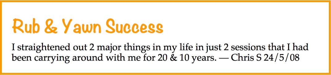 You may have noticed that this whole subject is not covered in Wikipedia. Or anywhere else in mainstream science. Quite honestly, this is all somewhat-experimental cutting-edge research dealing with a person's extended anatomy, his or her subtle-energy processes. At a rough estimate, maybe 80% of people who follow the instructions seem to do OK with Rub & Yawn procedures. What's with the 20%? Possibly they haven't followed the instructions properly and they are doing something else. A session is unlikely to go well, for example, if the person is hungry or short of sleep, or short of energy for some other reason. Possibly they really are following the instructions exactly and it still isn't working. Maybe they need to work at it longer than others in order to open the subtle-energy pathways. You also might want to look at the "Letting Go of Stress" section in this post.