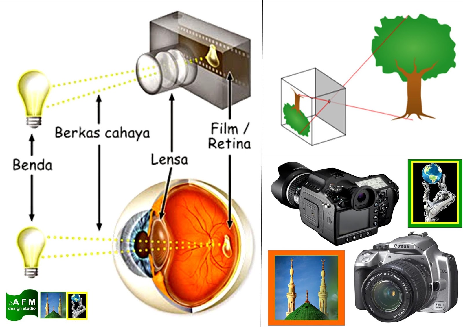 Mata merupakan salah satu anugerah terindah dari Tuhan. Mata merupakan salah satu organ tubuh yang berperan sangat penting bagi kehidupan, yaitu melihat. Tidak hanya melihat, bahkan mata juga berfungsi untuk merekam segala aktivitas yang dilakukan oleh manusia dan hewan yang kemudian rekaman tersebut di simpan di dalam otak. Kapan pun kita ingin memutar rekaman itu kembali maka otak pun akan memproses rekaman tersebut sehingga muncul yang namanya “Ingatan”. Dalam dunia sains, mata merupakan alat optic yang bekerja lebih canggih bila dibandingkan dengan kamera. Bahkan kamera itu sendiri dibuat berdasarkan prinsip kerja dari Mata. Berikut beberapa bagian dari mata dan kamera yang memiliki fungsi hampir sama.