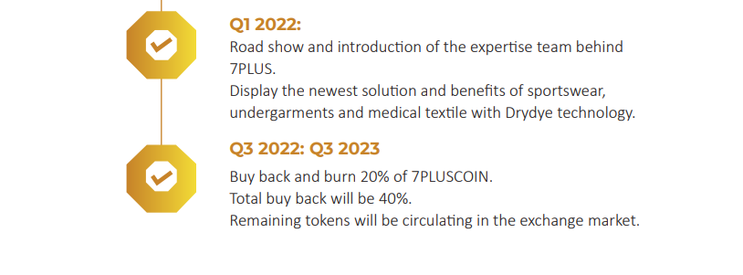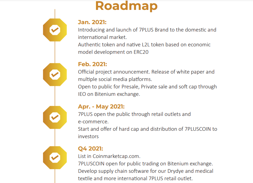 The 7pluscoin has a total supply 200,000,000, and the price per token is $0.1. The total fund expected to be raised at $20 million. The first stage of token sales will be held from February 12, 2021 to February 28, 2021. Those who buy within this period will receive a 25% bonus on their purchase. The second phase of token sale will hold between April 1, 2021 to May 31, 2021. Those who purchase within the first two weeks of sale will receive 15% bonus. If you buy within 3-4 weeks of sale, you will receive a 10% bonus. Also, those that purchase within 5-8 weeks will receive a bonus of 5%. All sales will end on May 31, 2021. After the soft cap or hard cap is reached, live trading will go public on Bitenium Exchange on June 1, 2021.