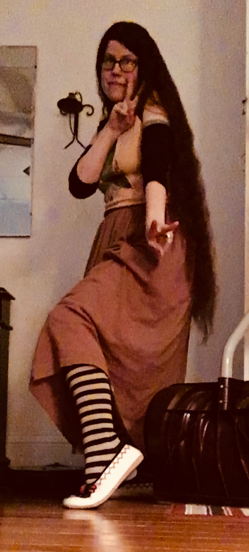 This is my “go-to” skirts pattern. It’s that woven material that never needs ironing because it’s crepe. This pink one is nice and thick, but i also made one in brown that is thinner.