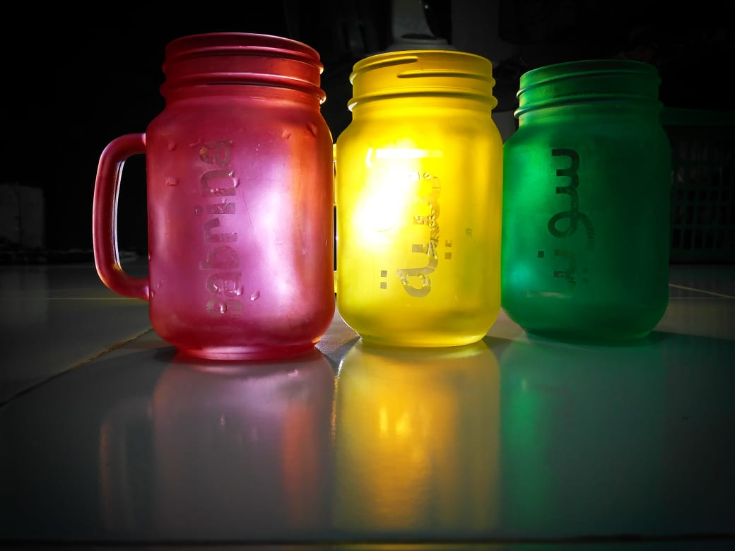 I get this colorful shadows from the drinking jar that my family usually used to drink juice or ice cold. As this evening i prepared orange squash to break the fasting, i took picture as i realize they could make colourful shadows! ;D Anyway these glasses have the owner's name carved on each glass. The pink one is my mother glass, while the green one engraved with my name Sonia in arabic letters.