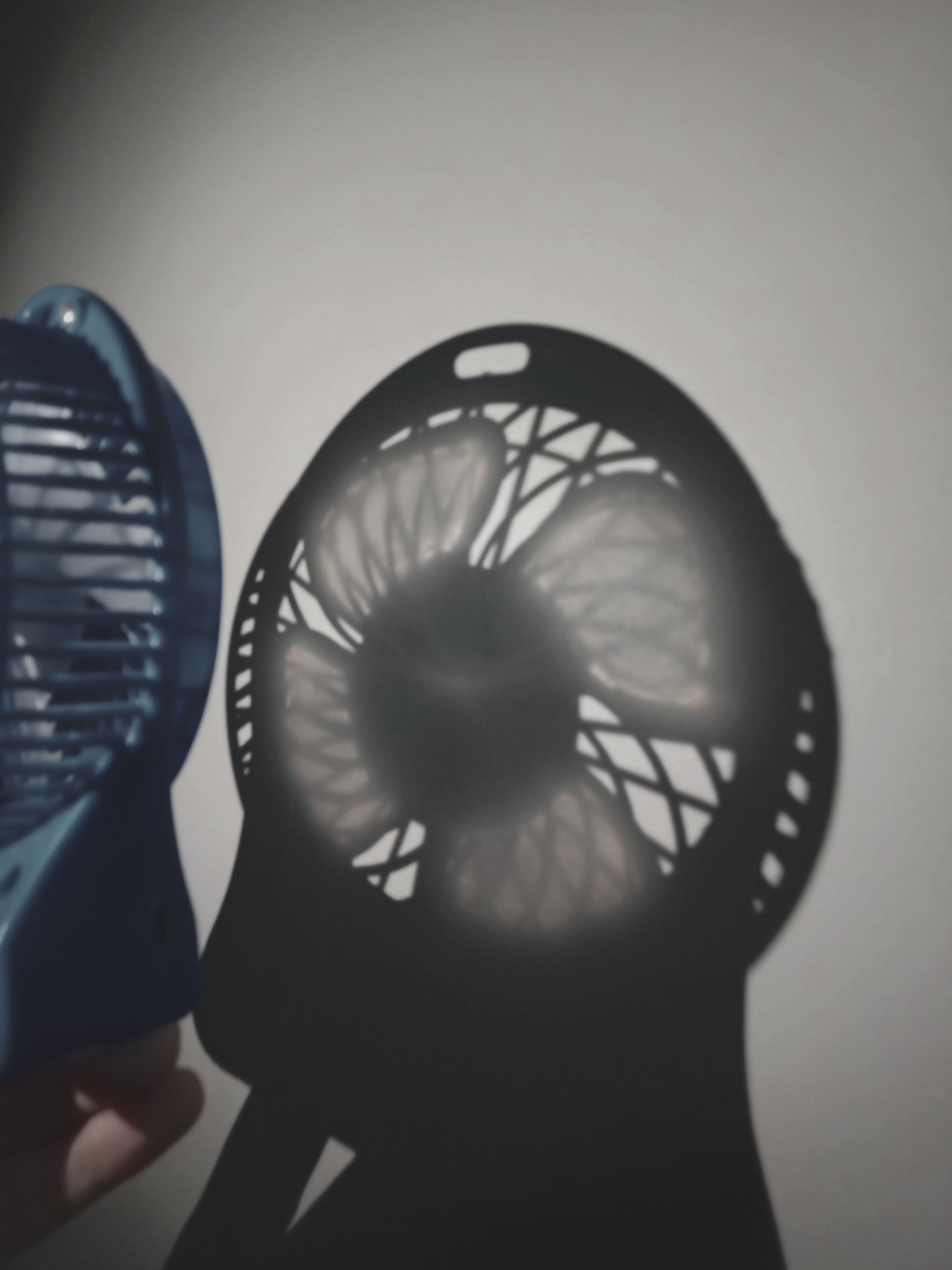 This is my mini chargeable fan that I always use when it is hot and brownout. I tried flashing light on it to see how its shadow looks. For me it is cool especially its blades.