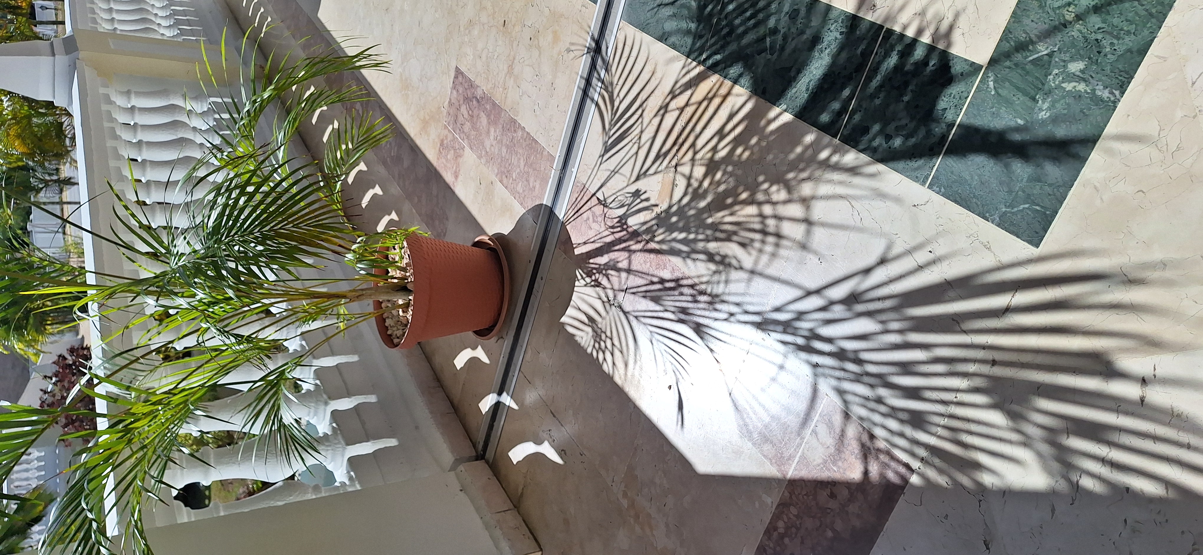 I always go looking for a good shade, but they were not easy to find since he had no sun for a few days. Well, today the sun said hi to us and was shining high perfect to capture a good one. I came across this plant pot with this awesome shade of a Dypsis lutescens, commonly known as Areca. The perfect shade reflecting on the floor showing every bit of this plant simetrically identical to the real.