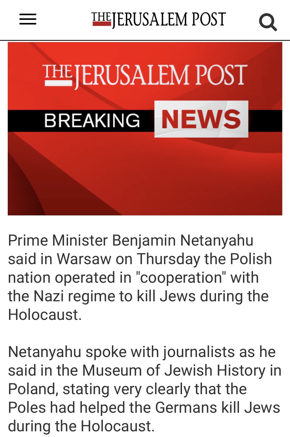 “Jerusalem Post: „Premier Netanjahu mówił w czwartek w Warszawie, że polski naród współpracował z nazistami [!] w mordowaniu Żydów”.