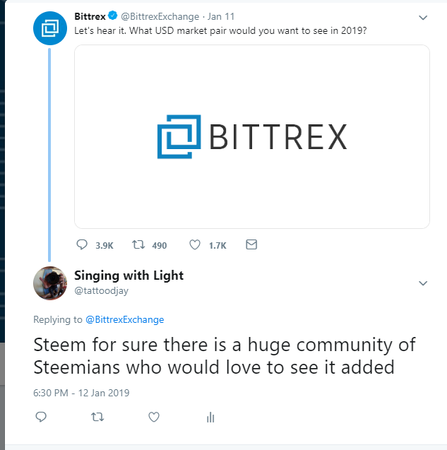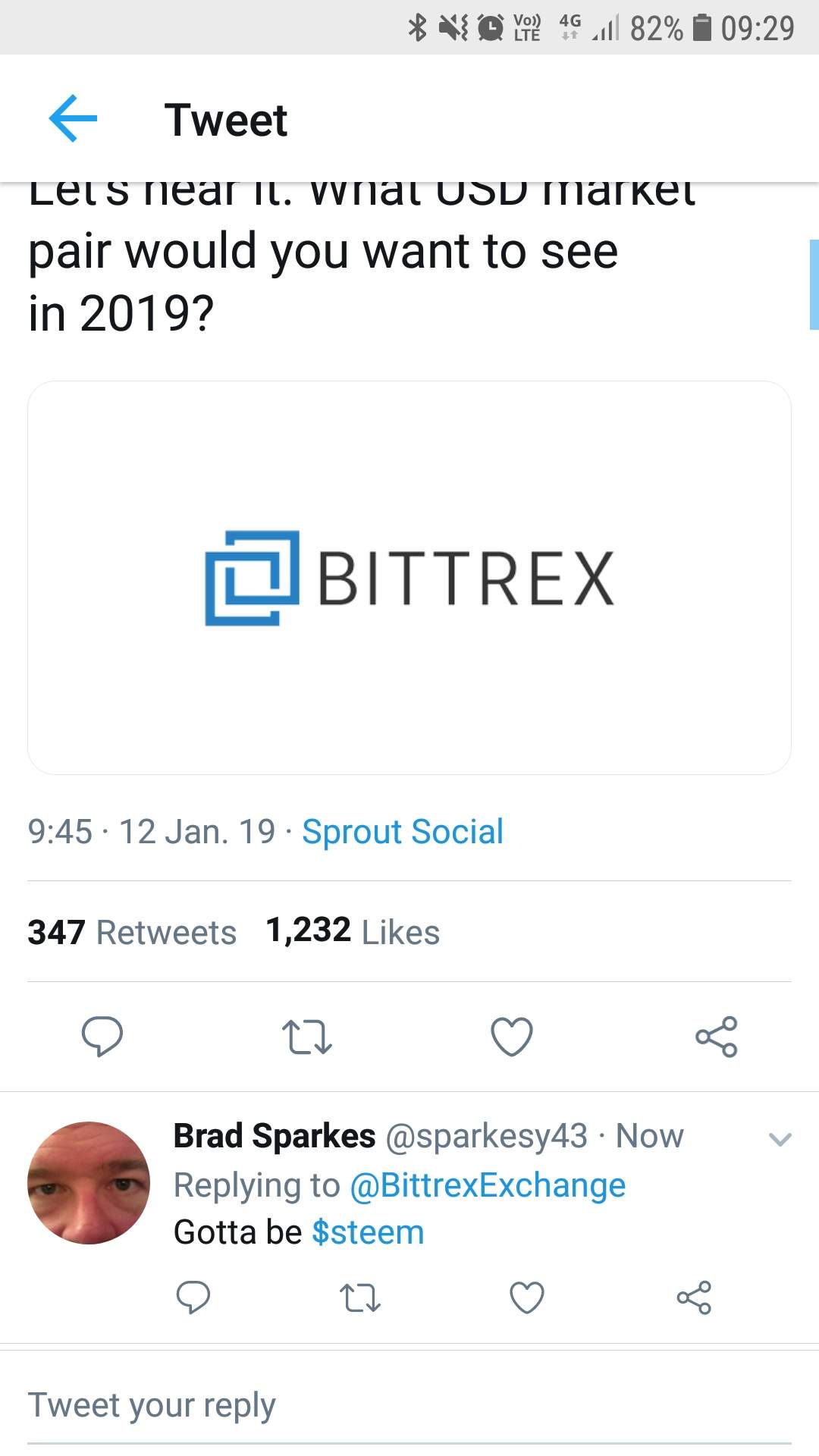 Help us to get Steem listed on Bittrex. It only takes a couple of seconds to comment with 'Steem' on the tweet Bittrex posted yesterday.