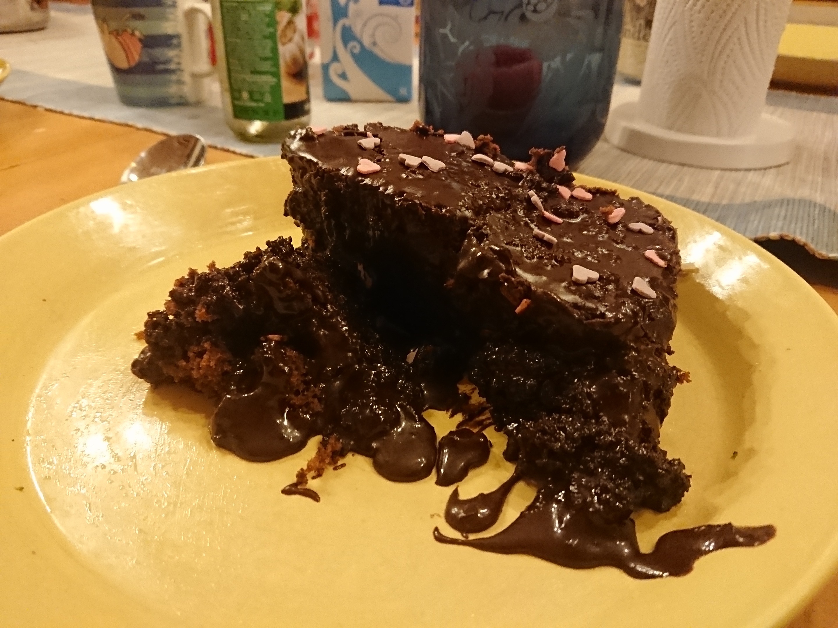 If you don't know what Mokkakka is, look for explanation here, I'm too lazy to explain. But in the picture you can see the evil twin - poop casserole - in the front and the good twin - brown lover - in the back. Poop casserole refers to the aesthetic aspect of the other half of frosted Mokkakka, but the real reason it is called an evil twin, is because it is a sinfully delicious treat with all the frosting that is inserted deep into the Mokkakka through the cracks. It is quite heavy though - potentially the heaviest matter in the universe - but that's the way we like it.
