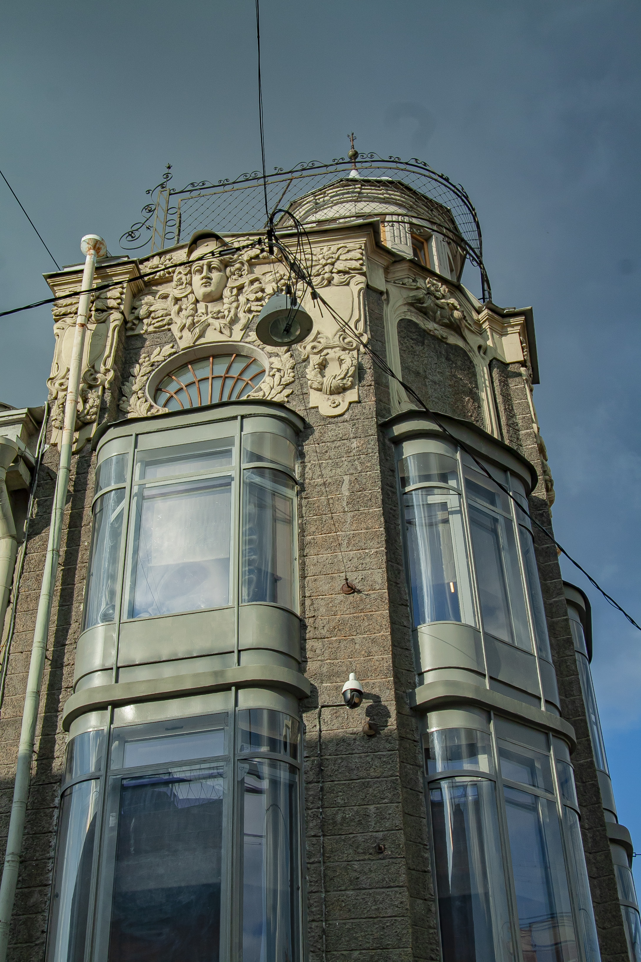 Walking in the same places, we soon discovered another attraction - the Tomilins' Apartment Building. Its corner facade with a turret is also made in the Art Nouveau style, but the elements of the building are more elegant and can be considered for a very long time.