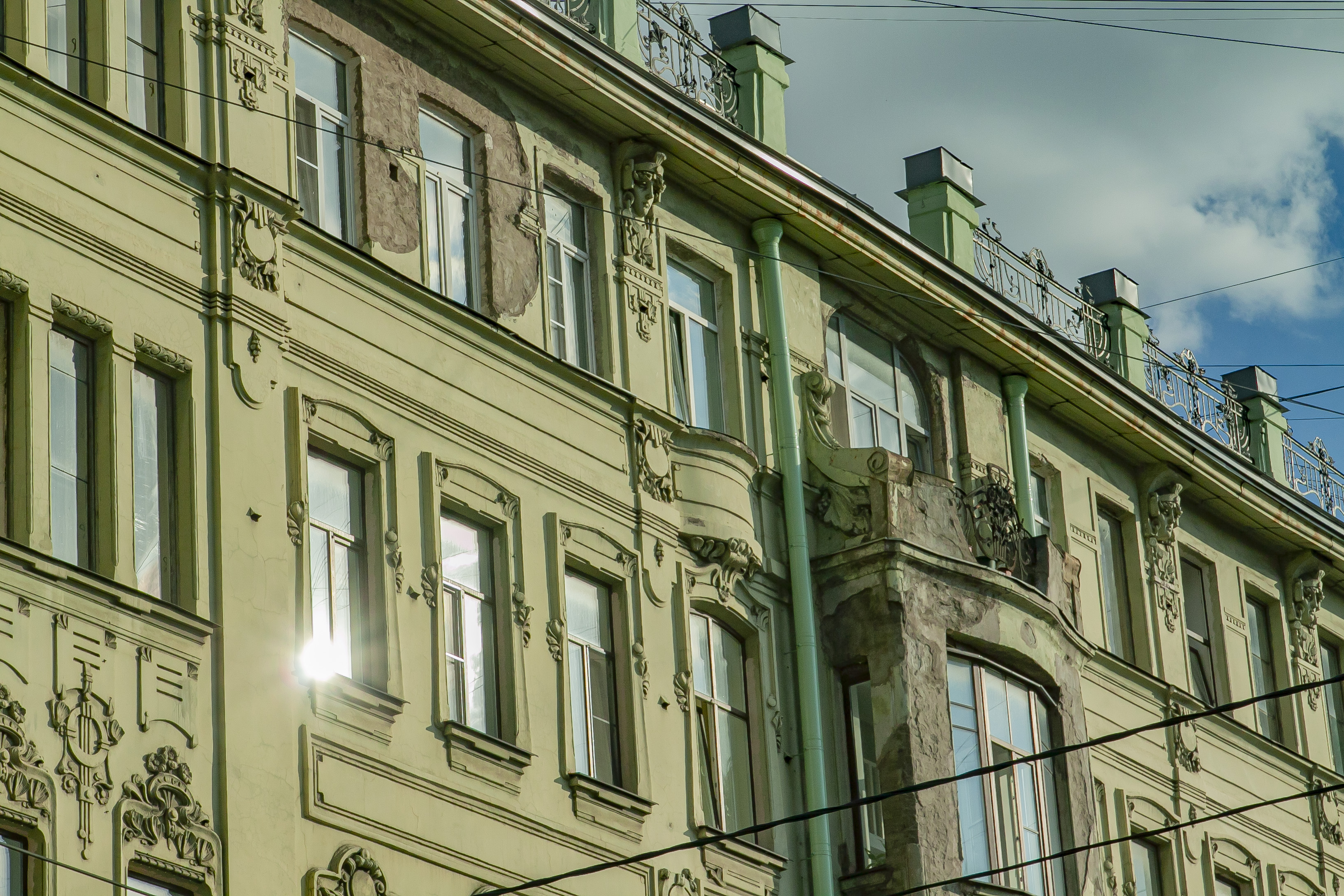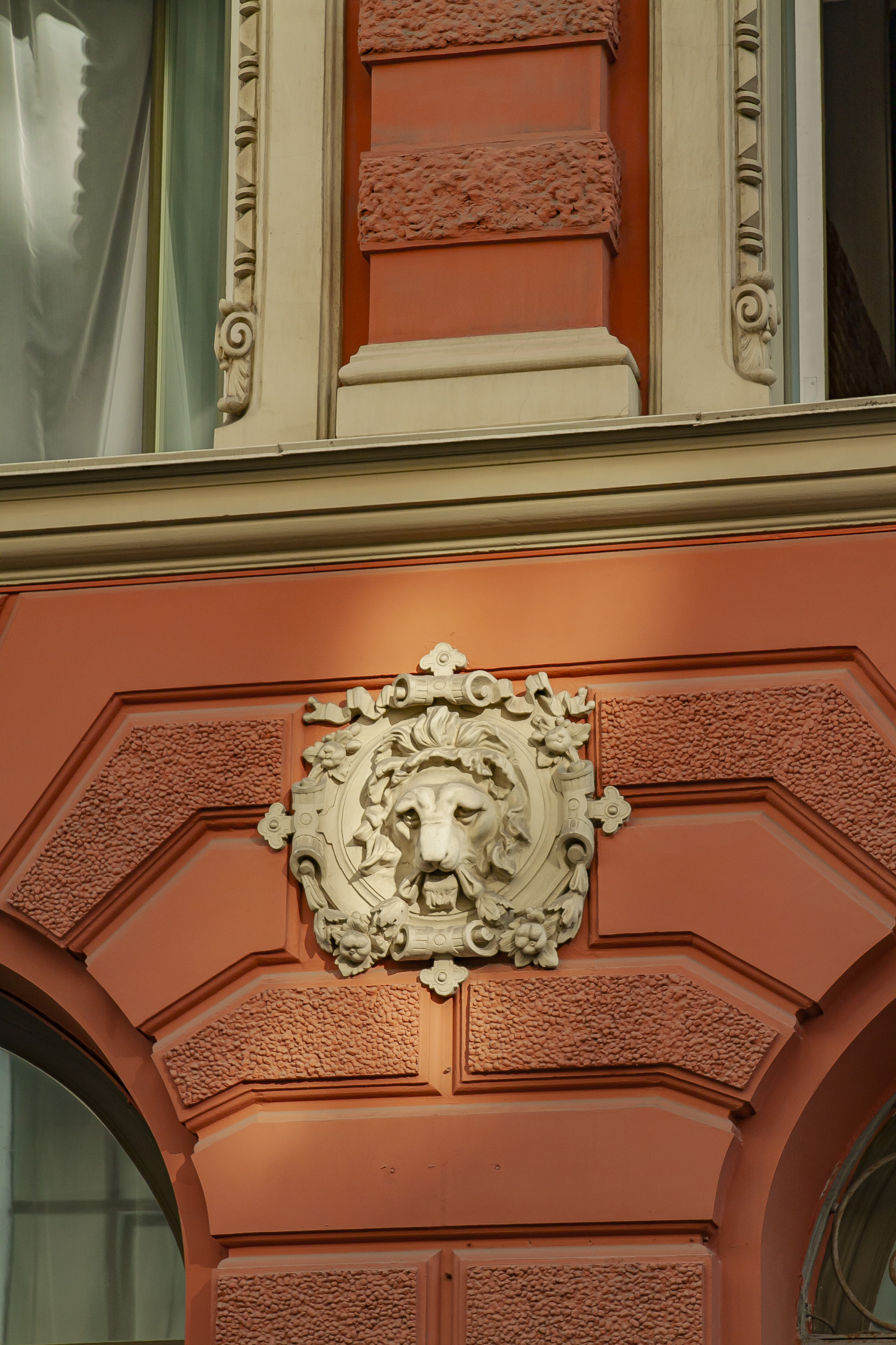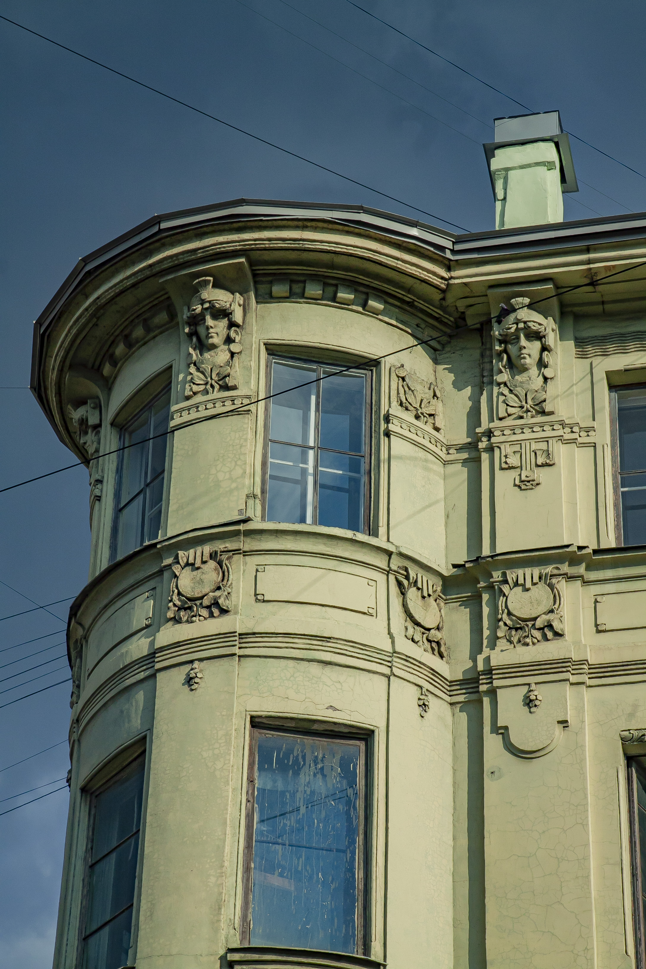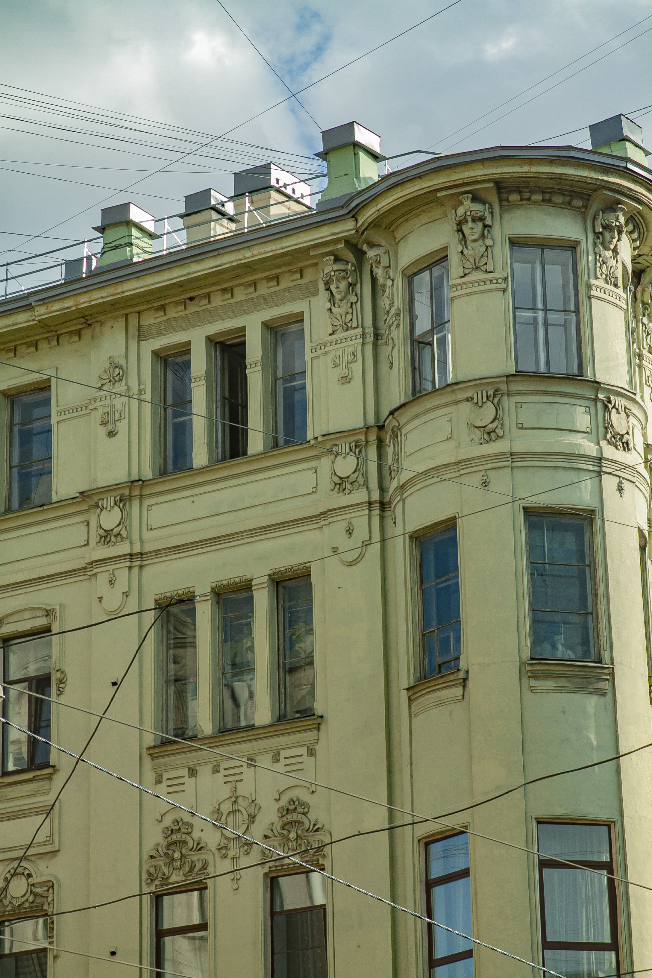 After a rather long hike, we approached the Bank Bridge with its Winged Lions. From here, the wing of the Kazan Cathedral is clearly visible, but we visited it earlier, so we will turn further to Bankovsky Lane, where I was attracted by a long Art Nouveau building and its interesting architectural elements.