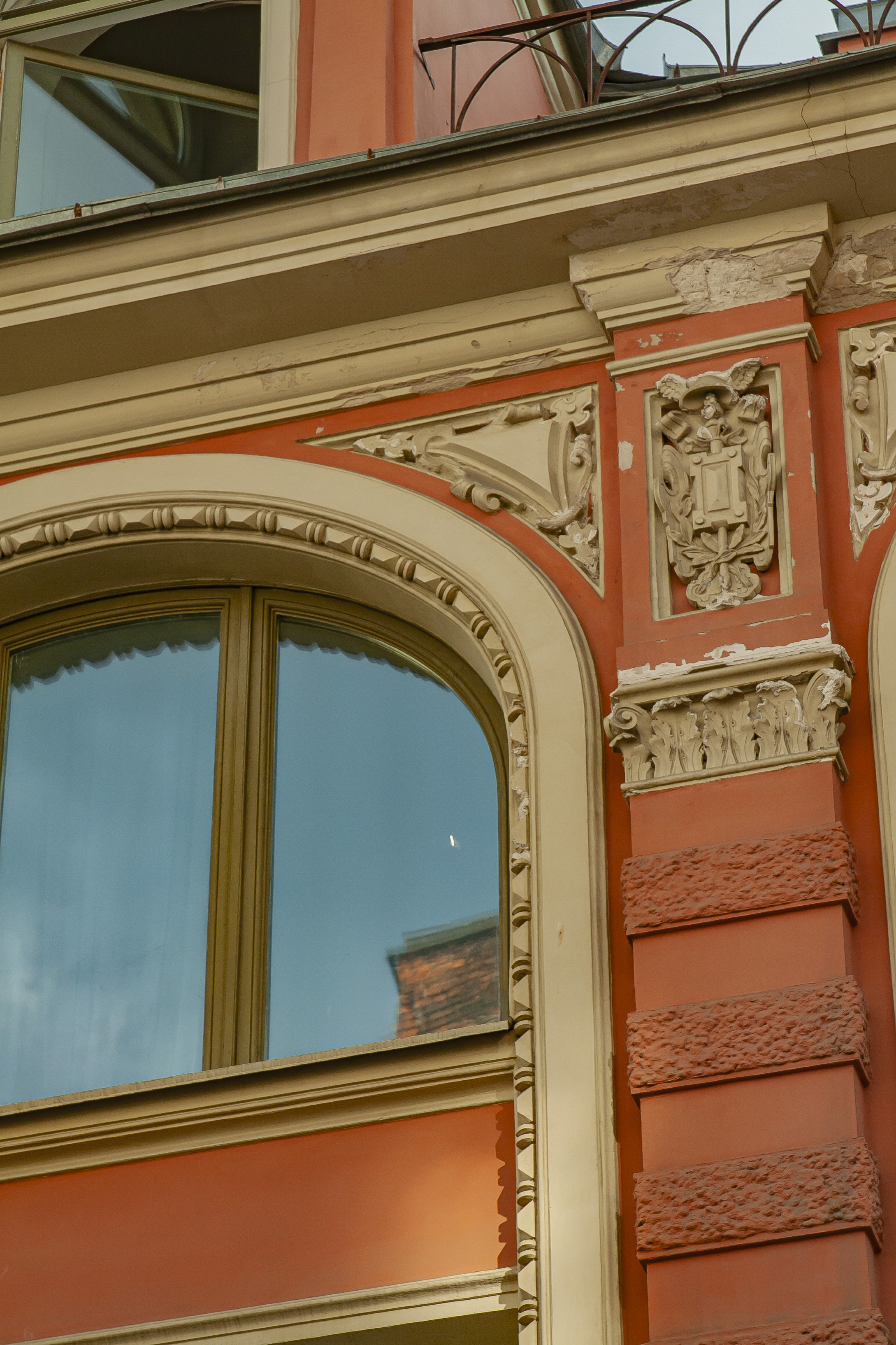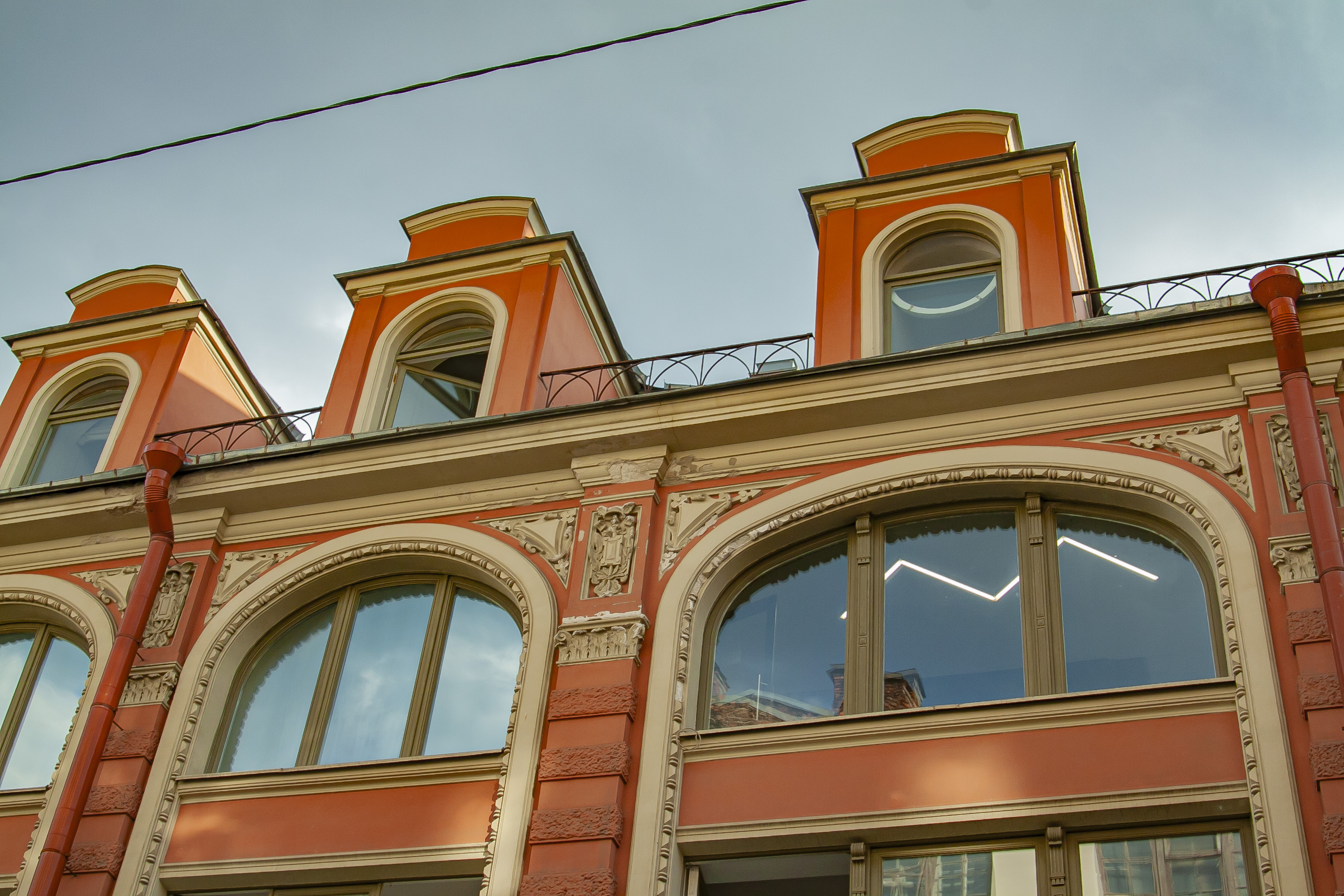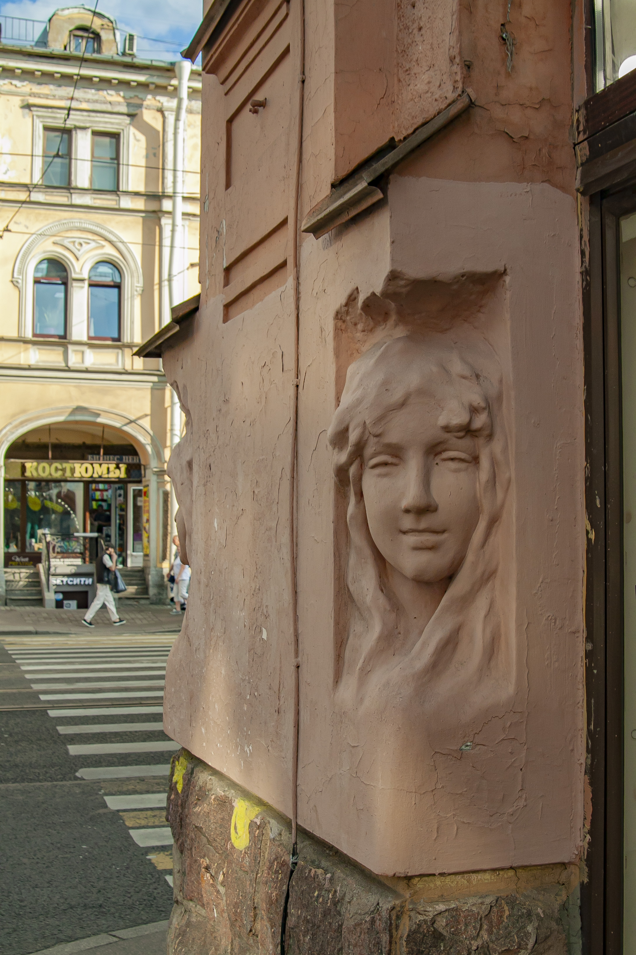 After a rather long hike, we approached the Bank Bridge with its Winged Lions. From here, the wing of the Kazan Cathedral is clearly visible, but we visited it earlier, so we will turn further to Bankovsky Lane, where I was attracted by a long Art Nouveau building and its interesting architectural elements.