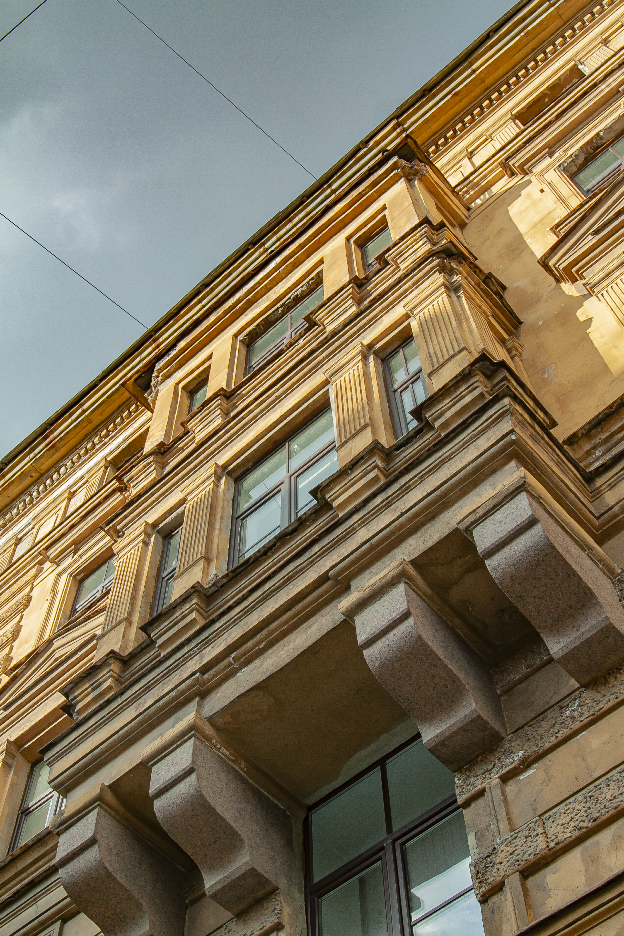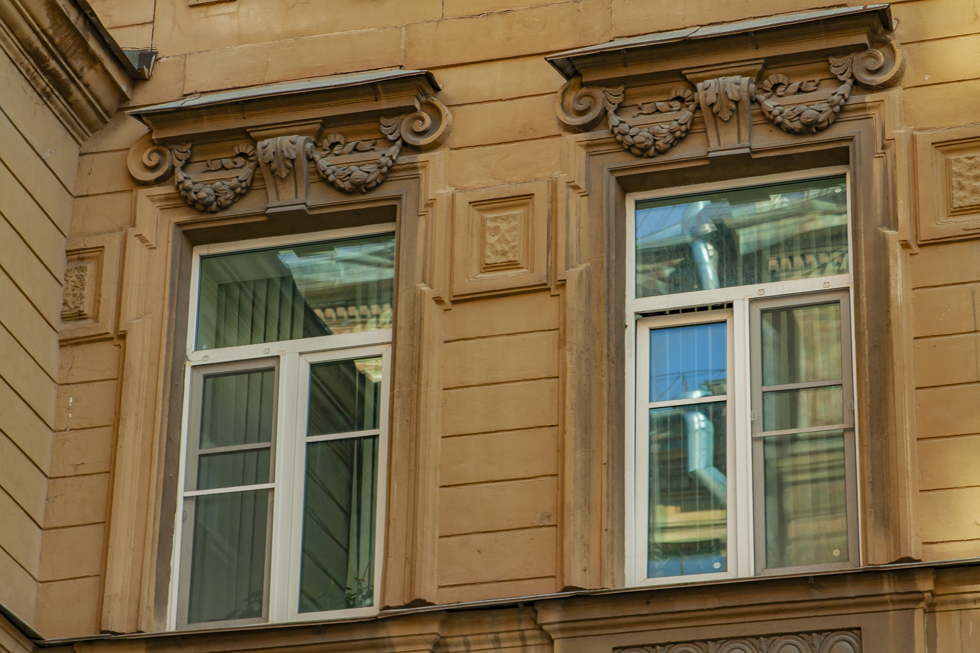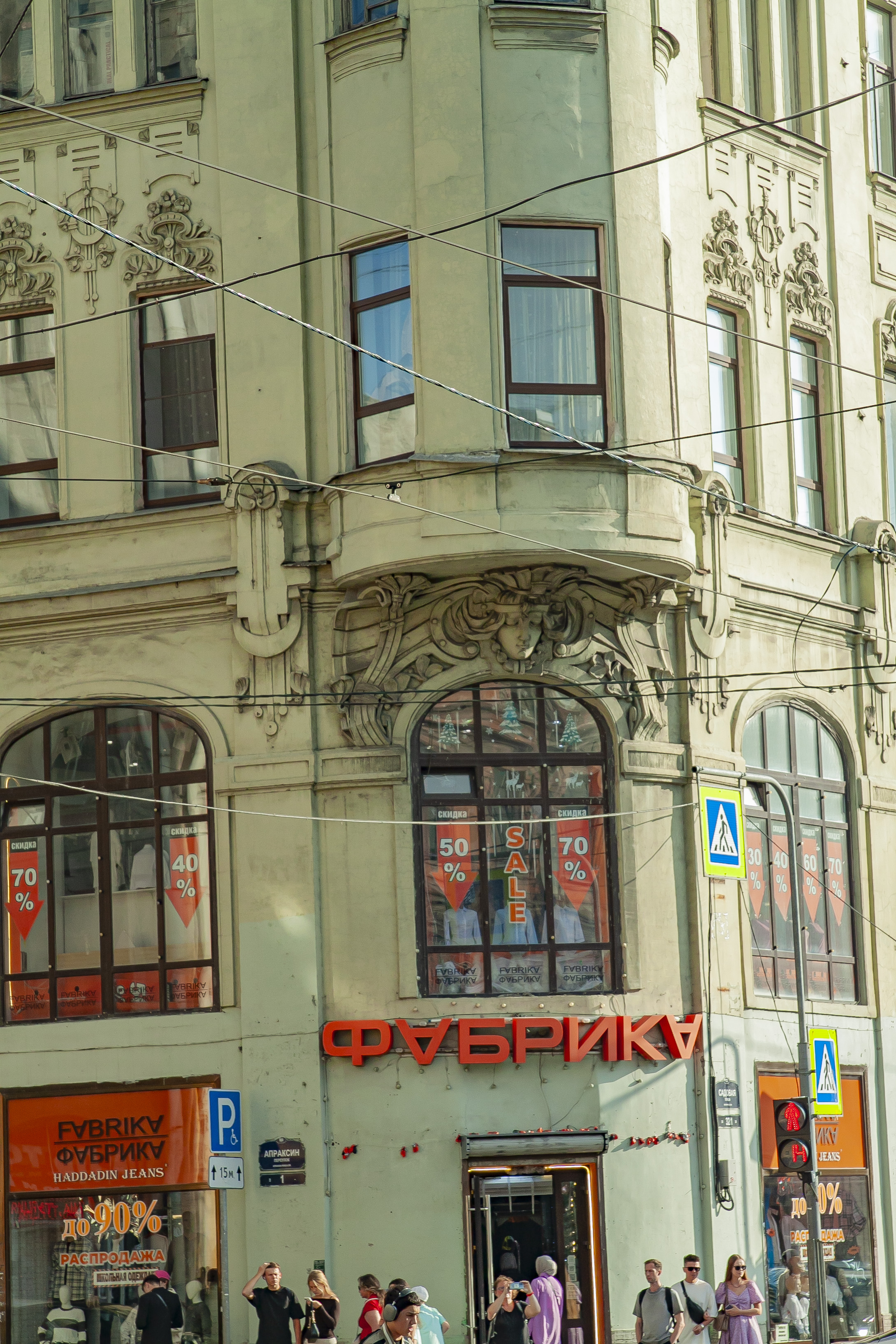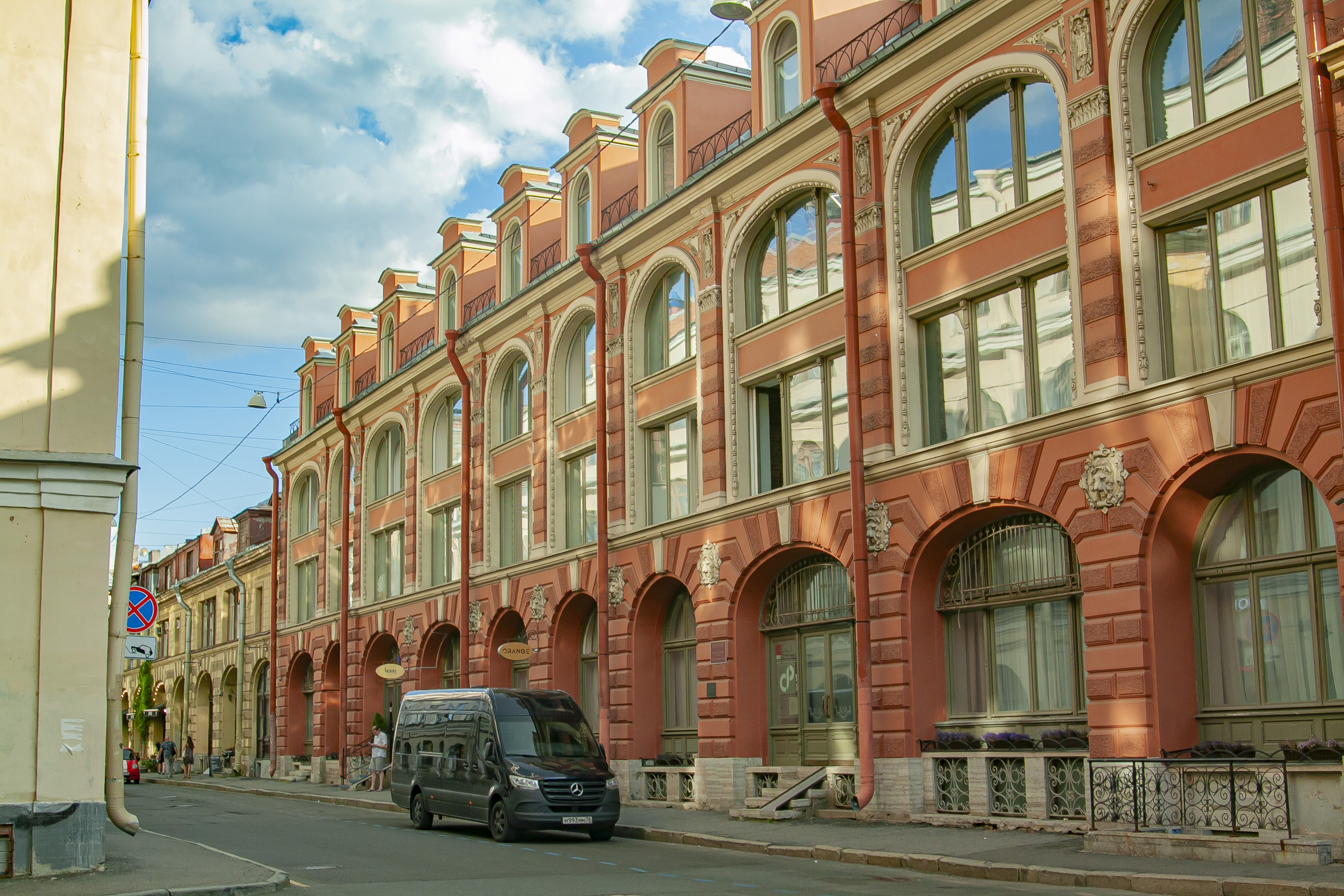 After a rather long hike, we approached the Bank Bridge with its Winged Lions. From here, the wing of the Kazan Cathedral is clearly visible, but we visited it earlier, so we will turn further to Bankovsky Lane, where I was attracted by a long Art Nouveau building and its interesting architectural elements.