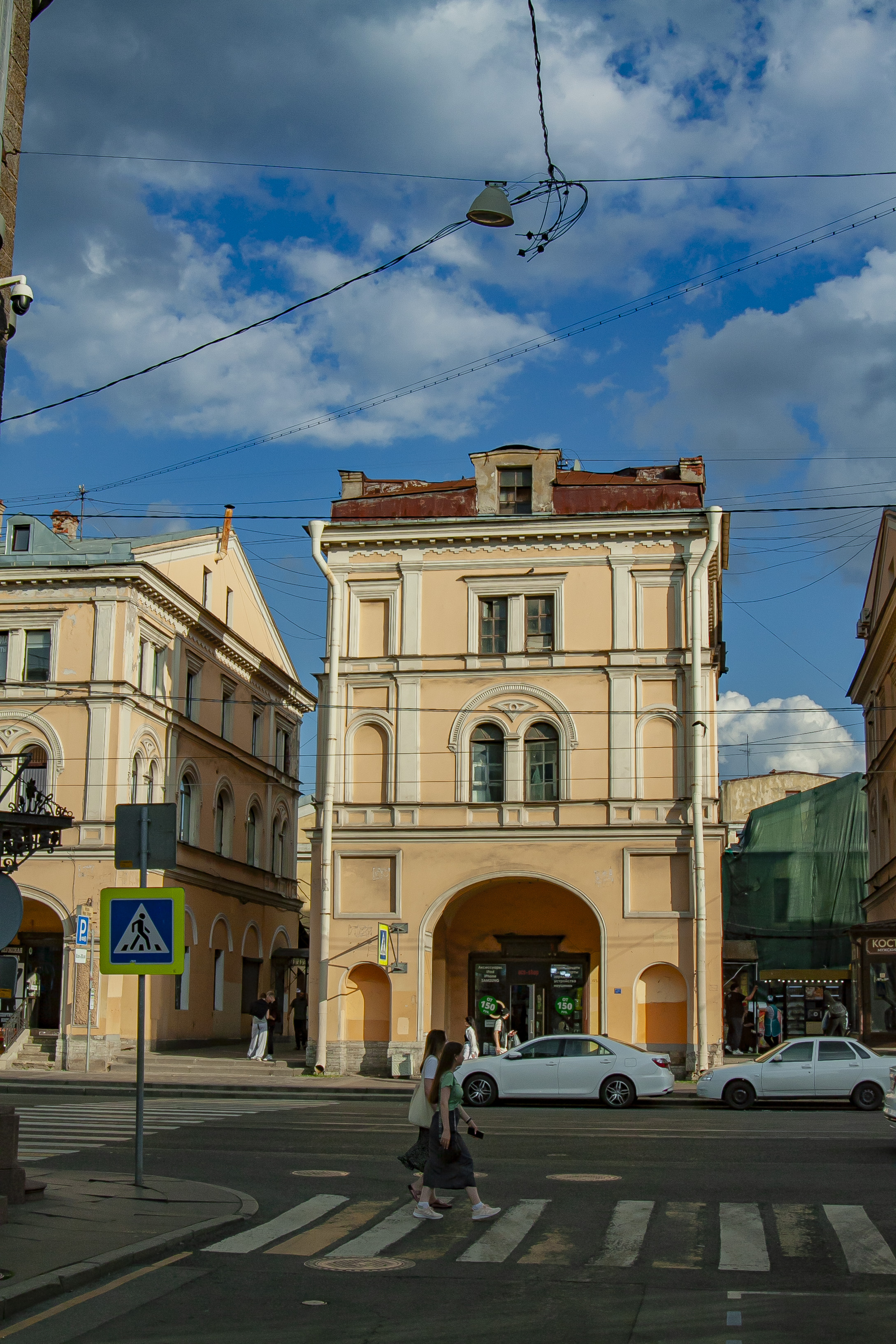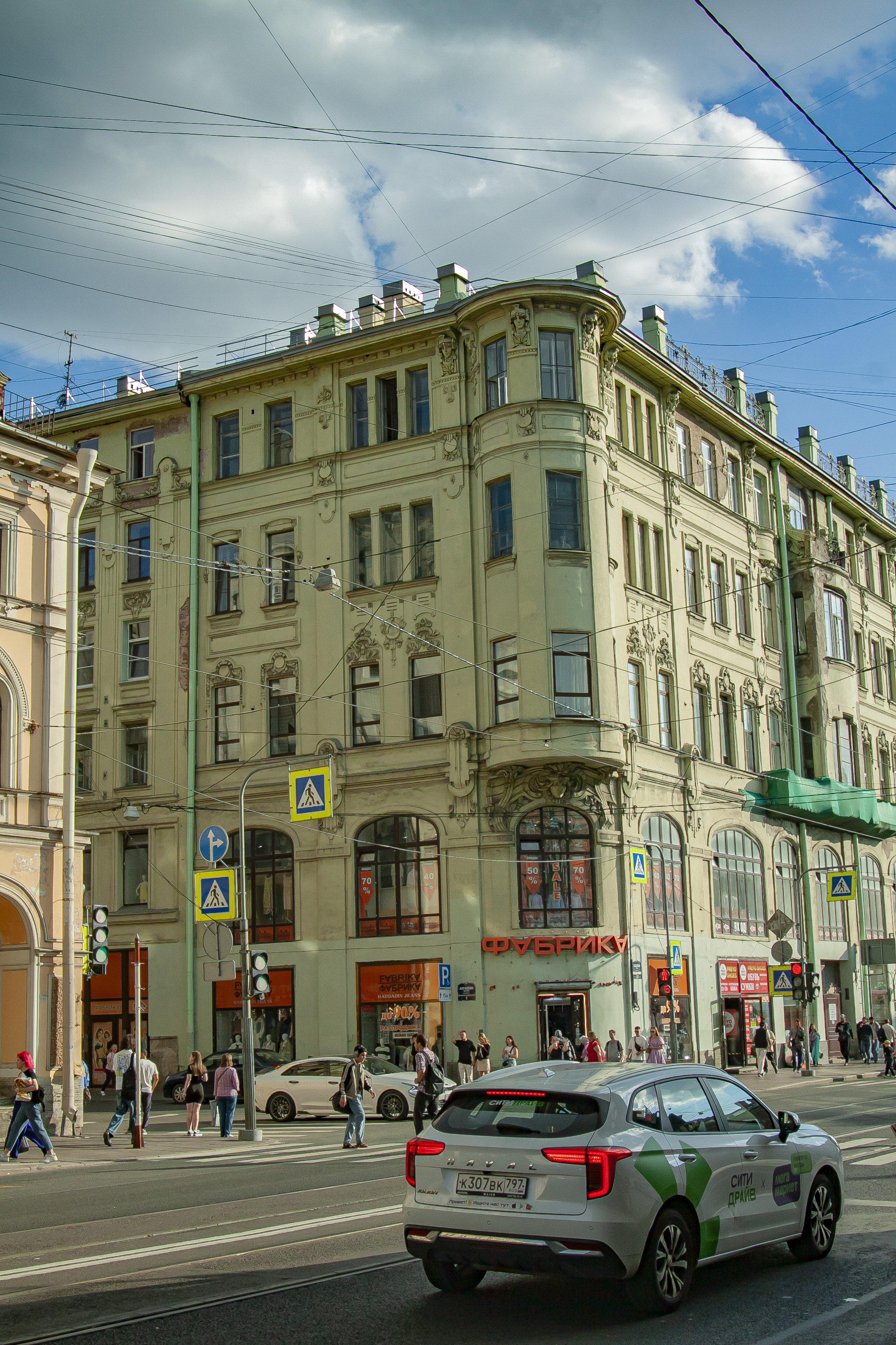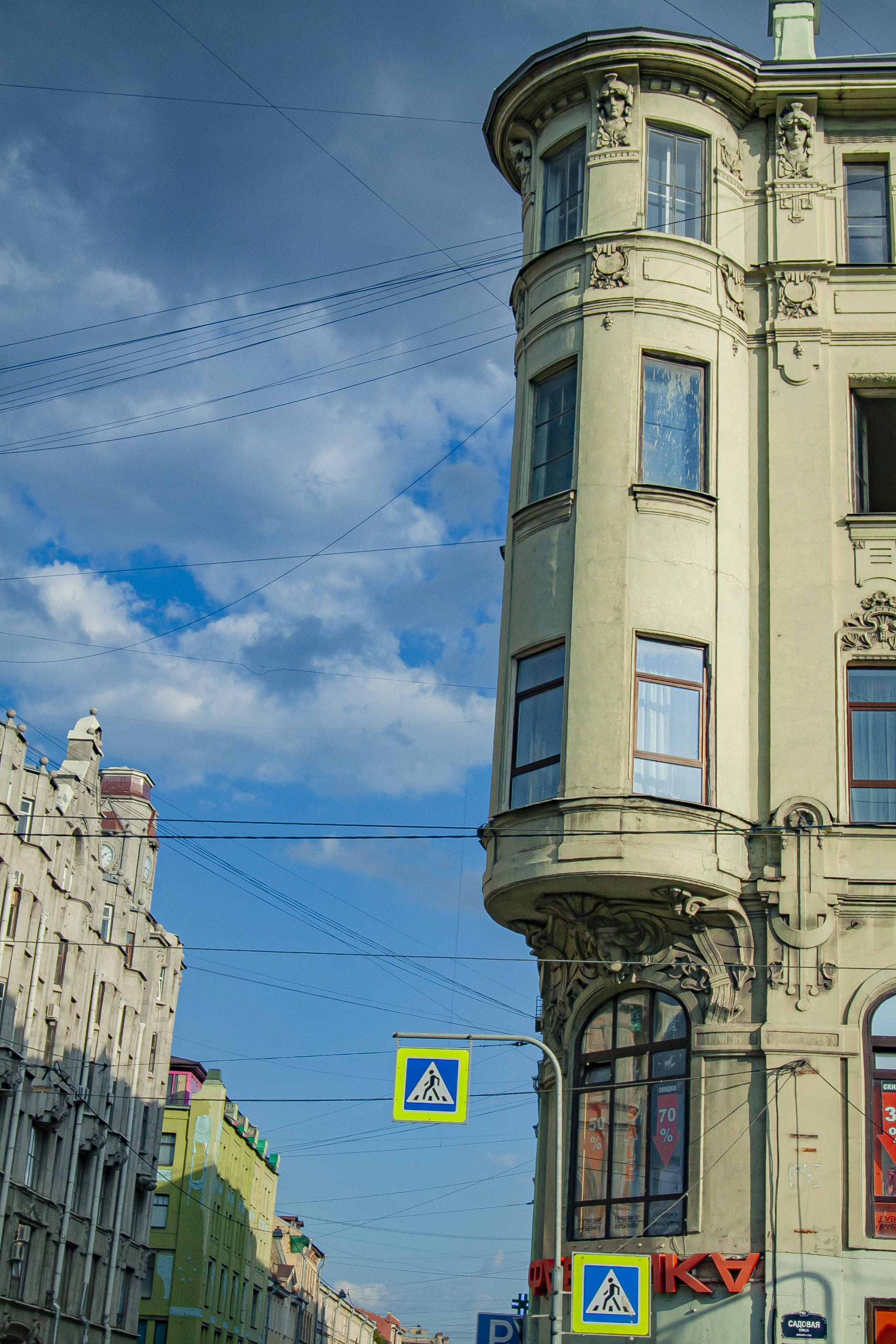 Совершив довольно догий пеший поход, мы приблизились к Банковскому мосту с его Крылатыми львами. Отсюда хорошо видно крыло Казанского собора, но там мы побывали ранее, поэтому завернём дальше к Банковскому переулку, где меня привлеекло длинное здание в стиле модерн и его интересными архитектурными элементами.