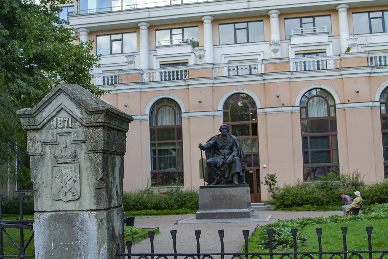 Maple Street led us from the castle to Manezhnaya Square. It is a very quiet and cozy place. In the center of the square there is a small fountain and benches where you can rest. In a semicircle from the fountain there are four small monuments dedicated to famous architects who took an active part in the construction of St. Petersburg.
