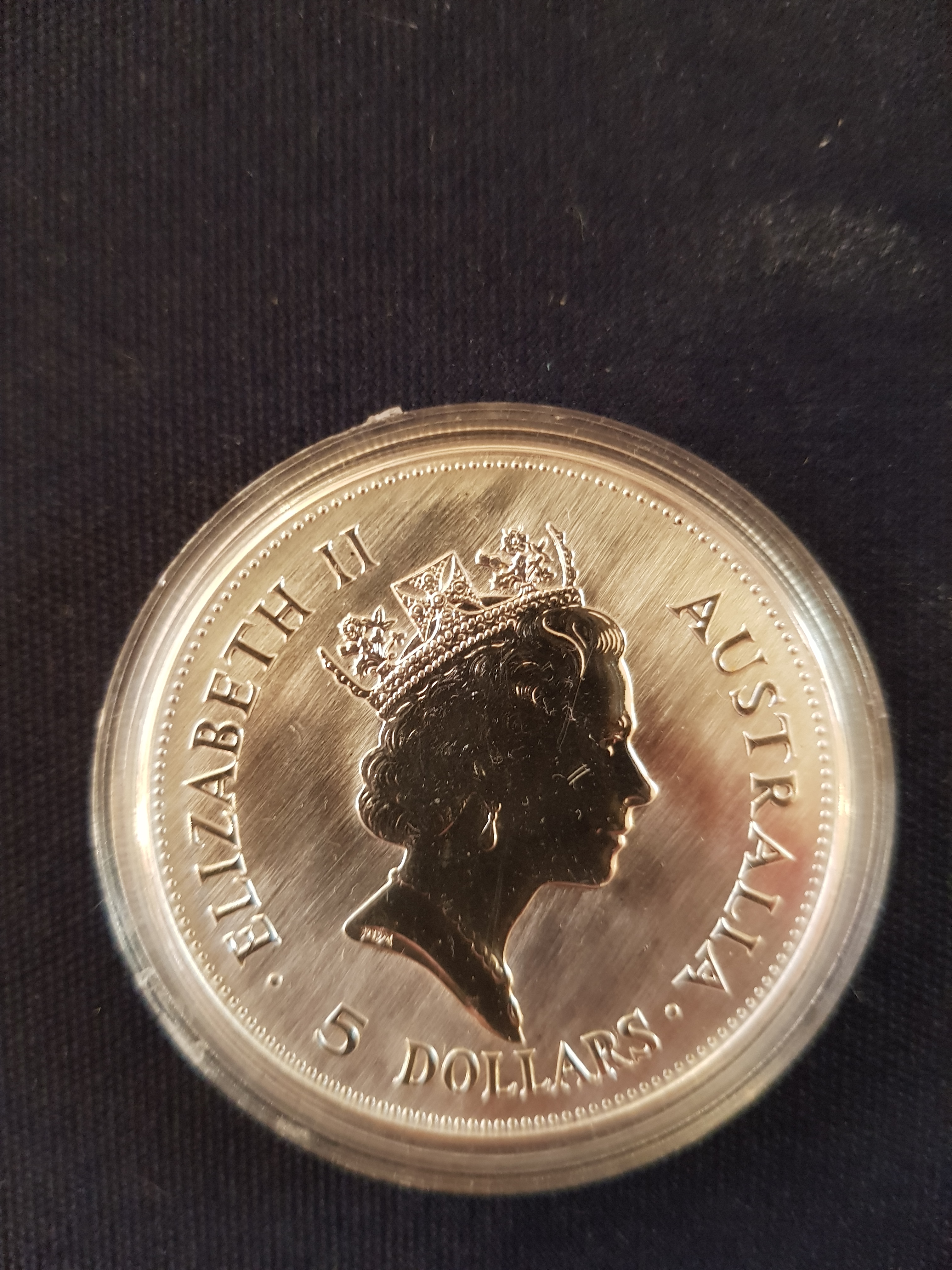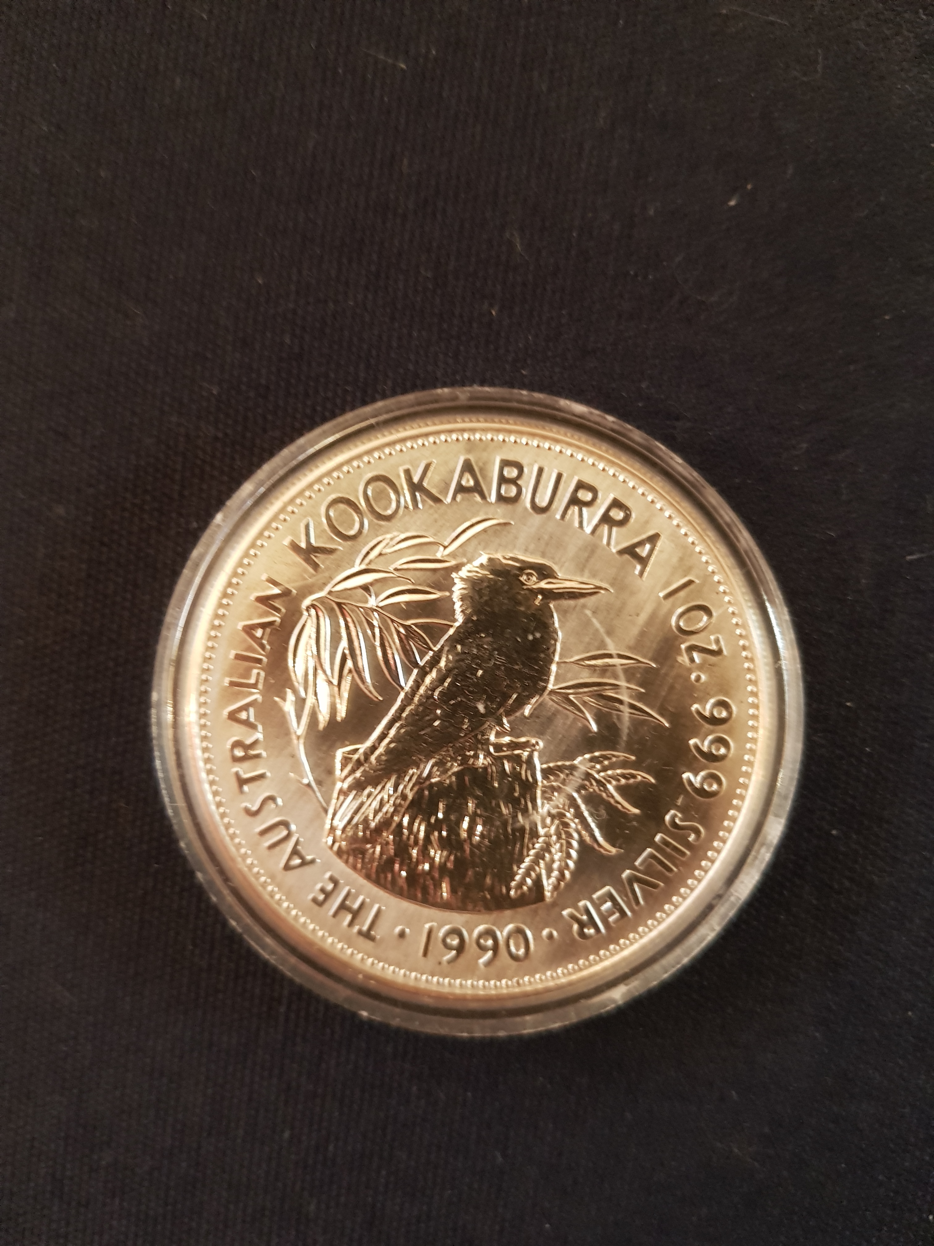 The 1990 Silver Kookaburra was the very first Kookaburra design released by the Mint, and it sold out of the whole 300,000 coins produced. The design on the rear of the coin depicts a Kooka ( as we call them here in Oz ) bird sitting on a cut tree stump, surrounded by foliage . On the front is Queen Elizabeth, and this is always the same, but as the years go on, you can see the more recent coins showing the wrinkles get deeper, and the double chin is more pronounced. The Kookaburra is one of the most Popular semi-numismatic coins in the world today because of the exceptional quality, limited mintage, and great designs which change every year. Older Coins such as this 1990 one, go for a high premium on the secondary market, and are getting harder to find as collectors buy up any pieces that are for sale.