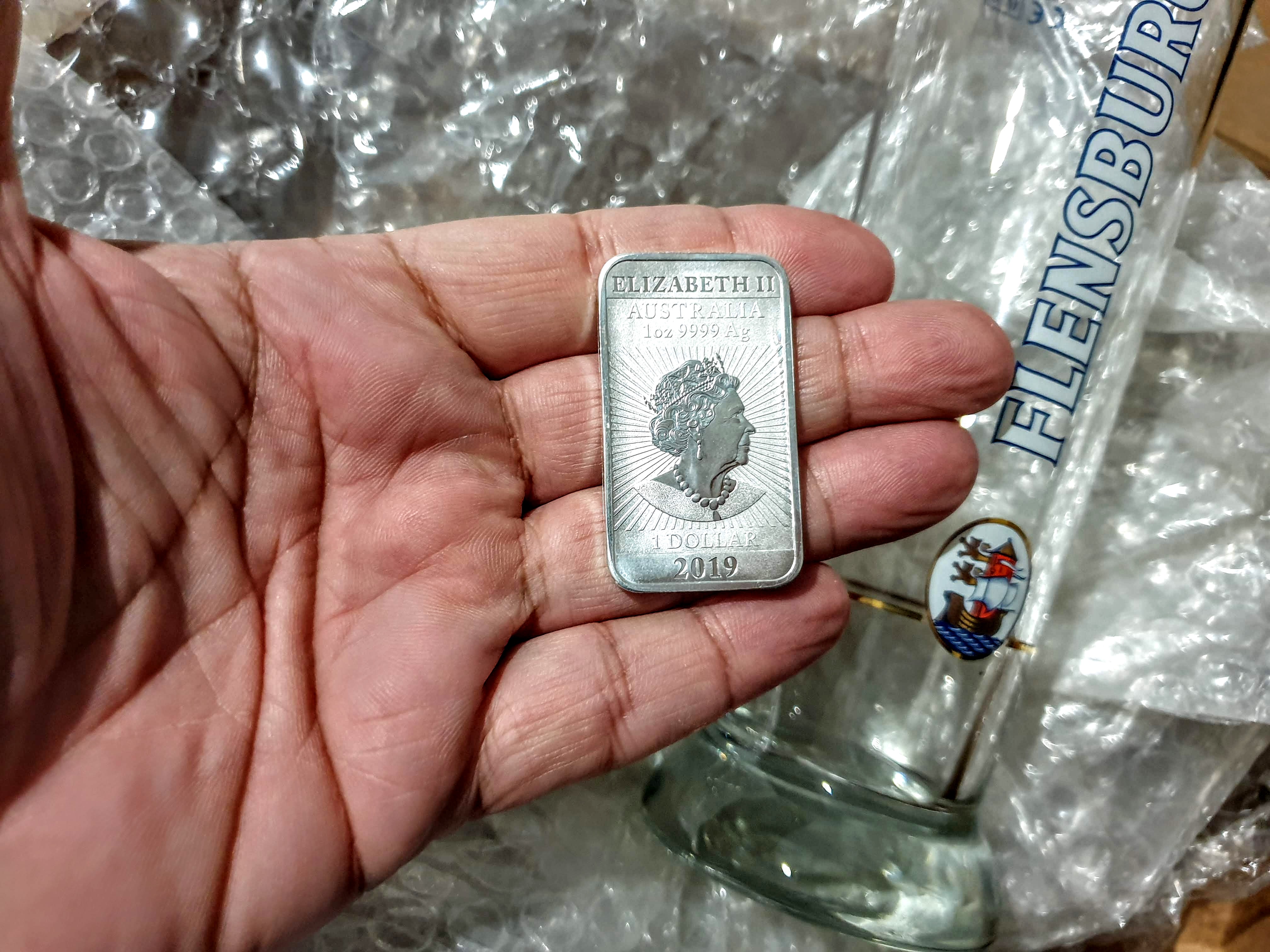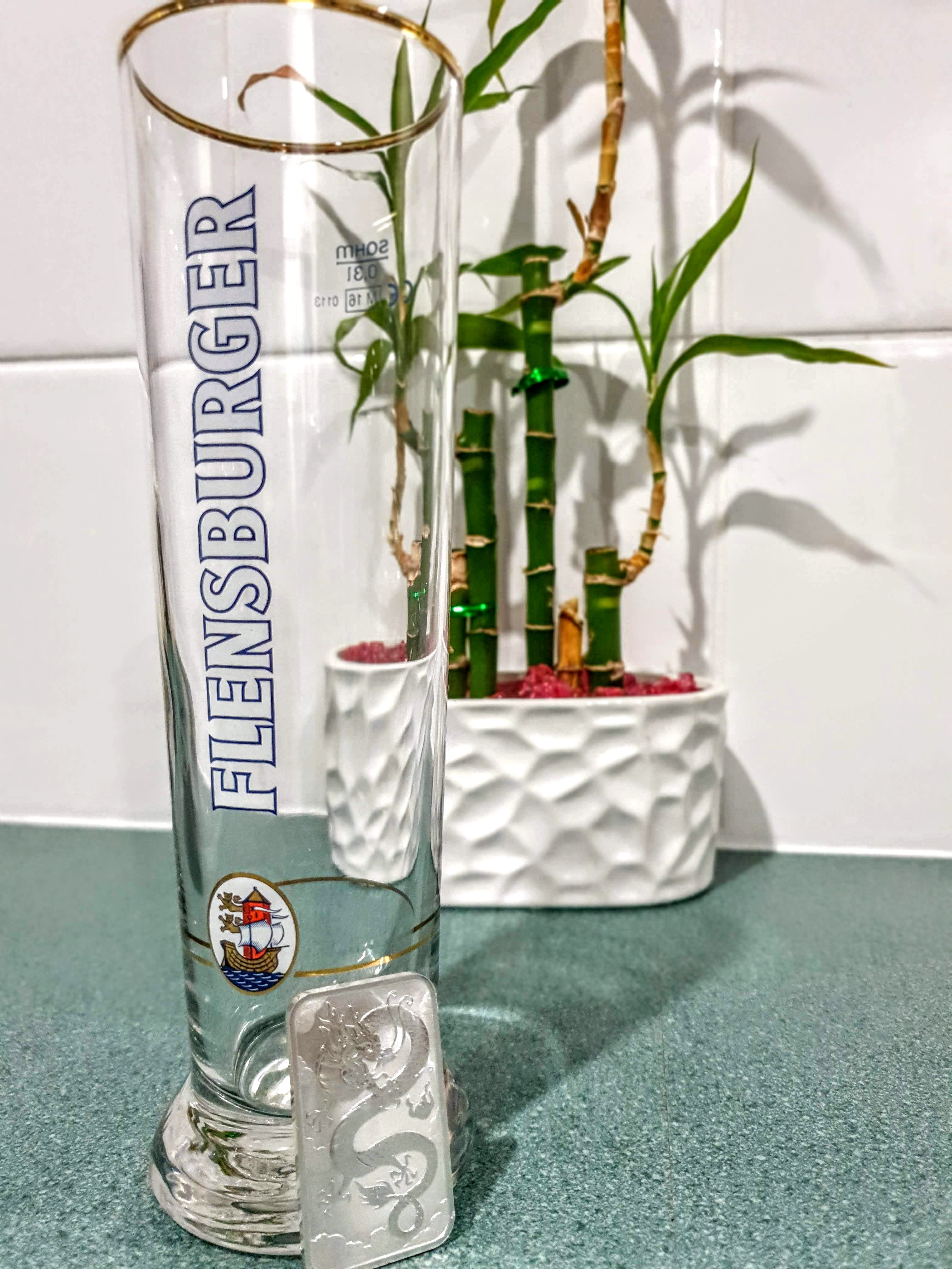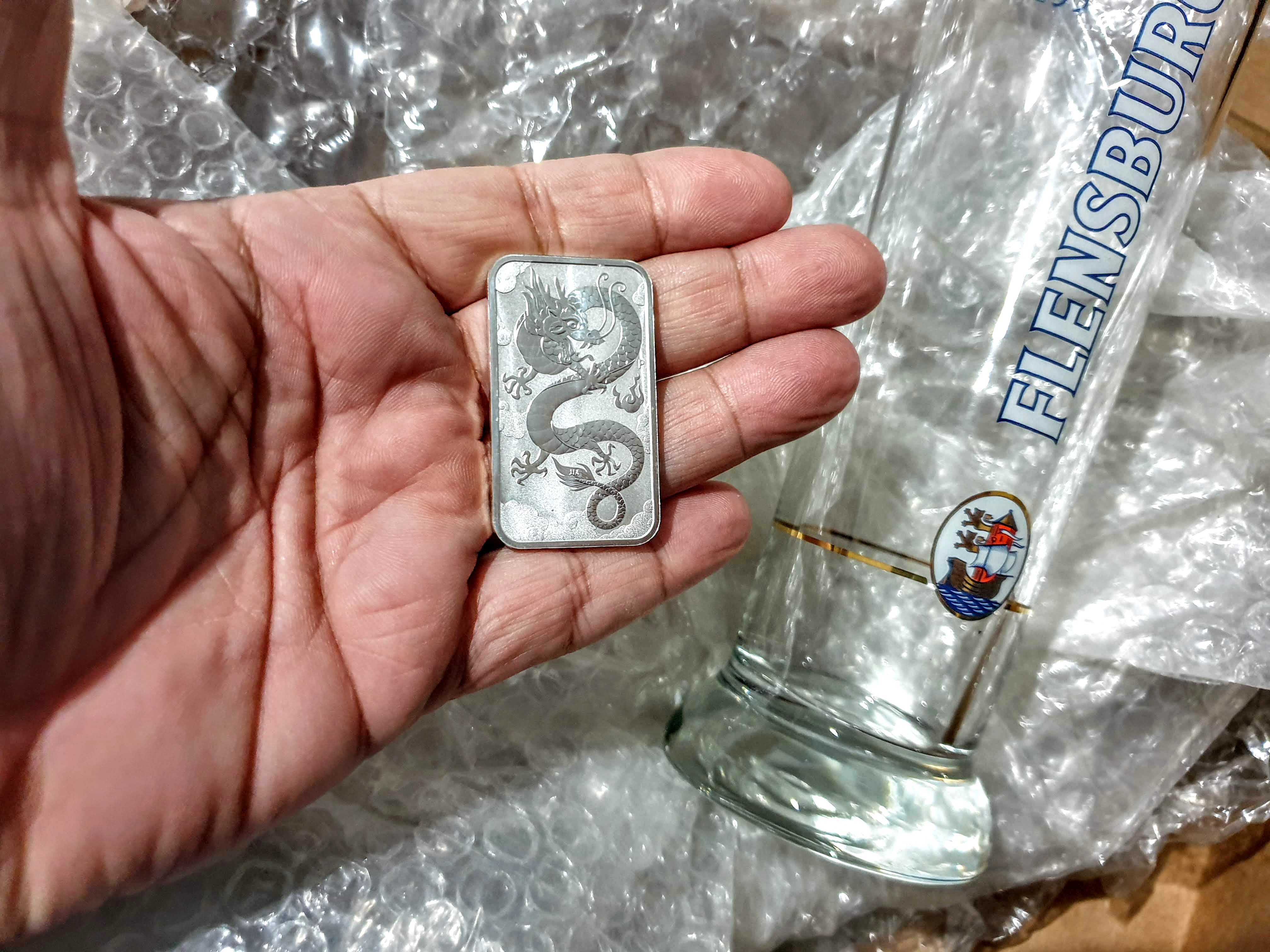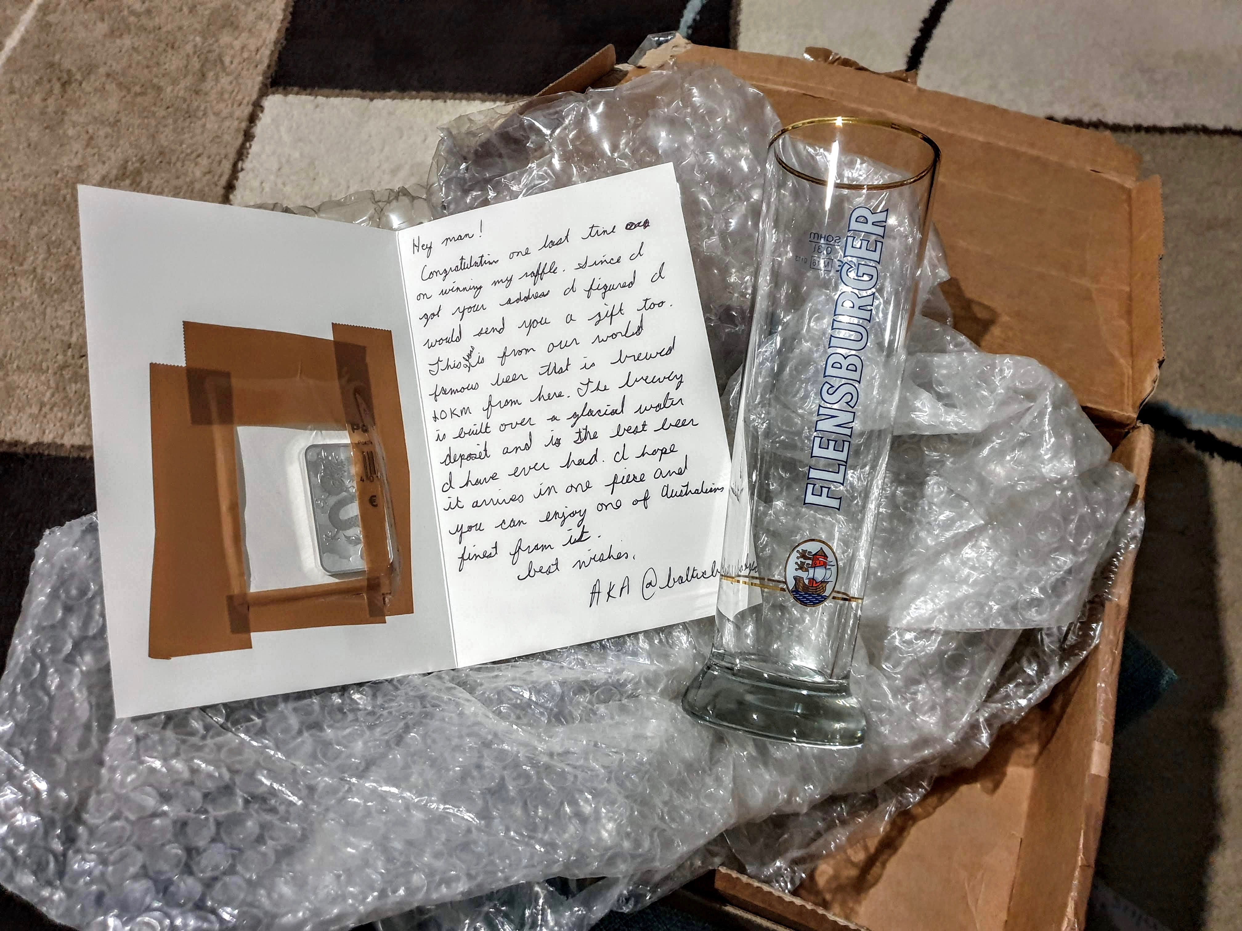 On opening the box I was to find a card with a nice message explaining the contents. Not only was there a piece of silver but there was also a very cool beer glass from a local brewery near by to @balticbadger's home. Flensburger beer hails from Schleswig-Holstein, Germany's northern-most State. The brewery was founded in 1888! Cool, and thank you sir!