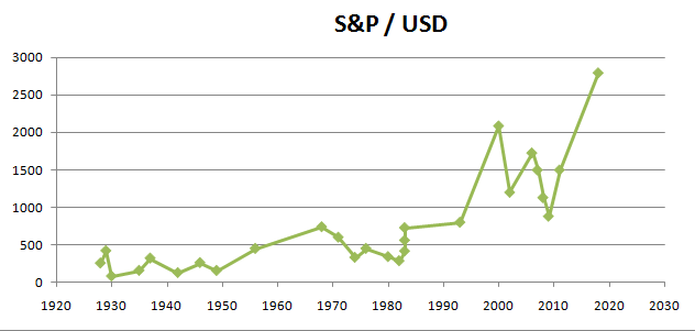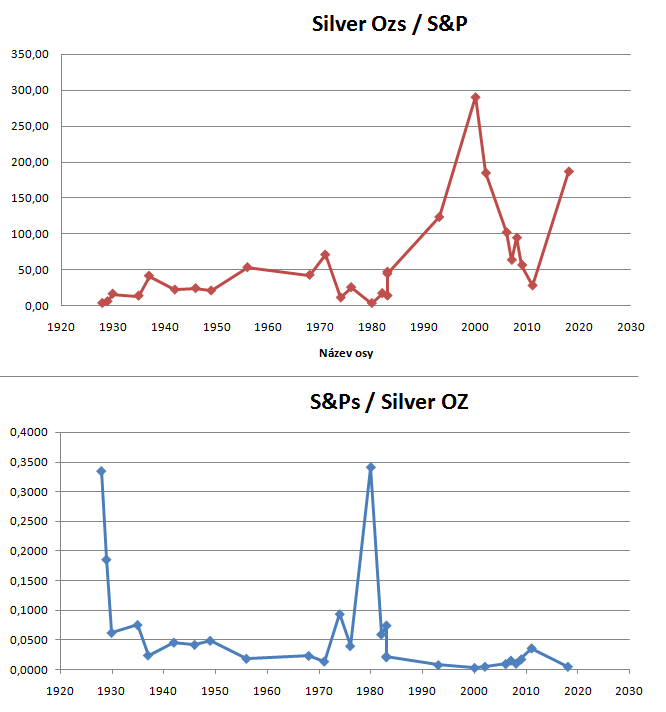 These graphs show the real value of one asset expressed by the value of the other asset. Dollars are not optimal for measuring value of assets because of the inflation and its continually decreasing value. I recommend checking you the same chart I have made except instead of silver I used gold ---->S&P to Gold.