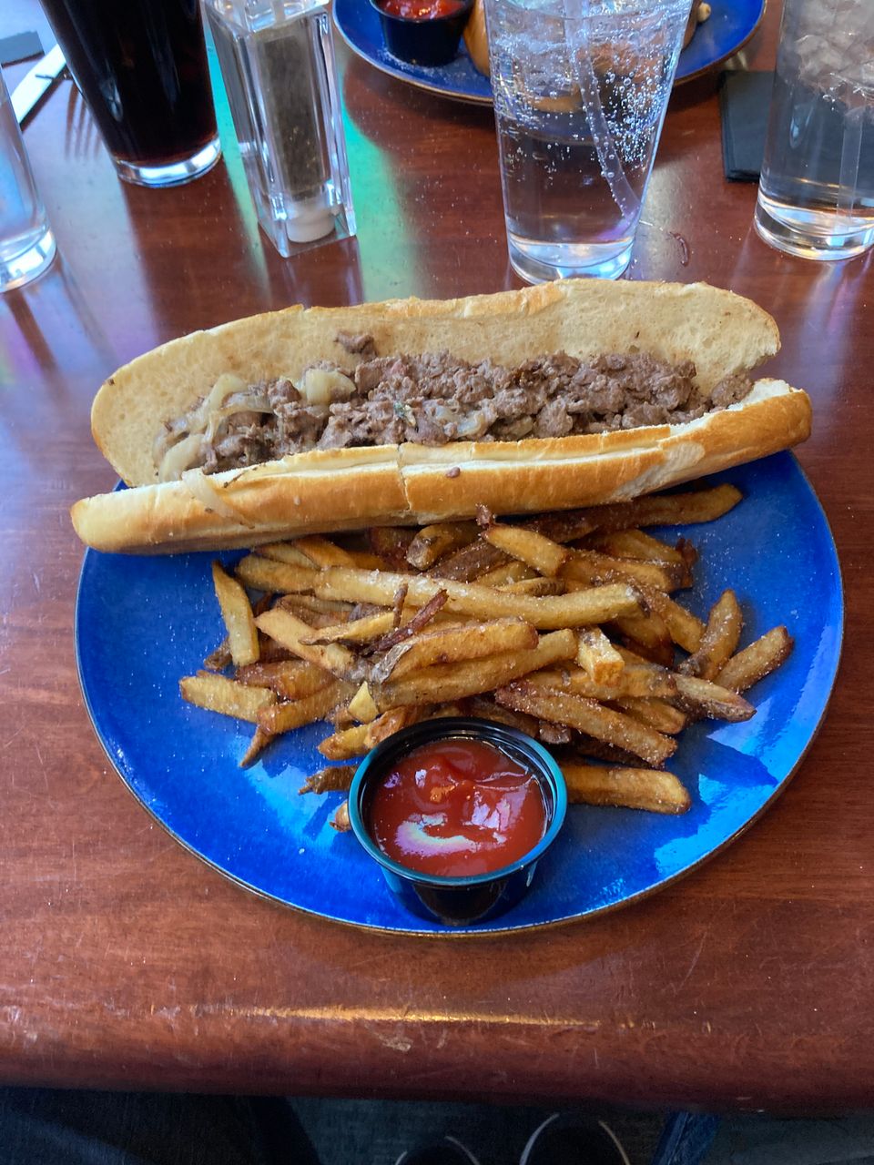 The restaurant had great reviews so we gave it a try. Jennifer decided on a wagu beef burger with caramelized onions, bacon and blue cheese served with hand cut french fries. I decided on a wagu beef cheesesteak with peppers, onions and a homemade aged cheddar cheese sauce also served with hand cut french fries.