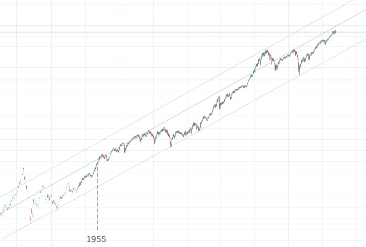 Looking at this chart I could speculate that before so-anticipated crash we first need to jump over the golden-bound. Another observation: we are probably somewhere around 1955 in terms of the channel position.