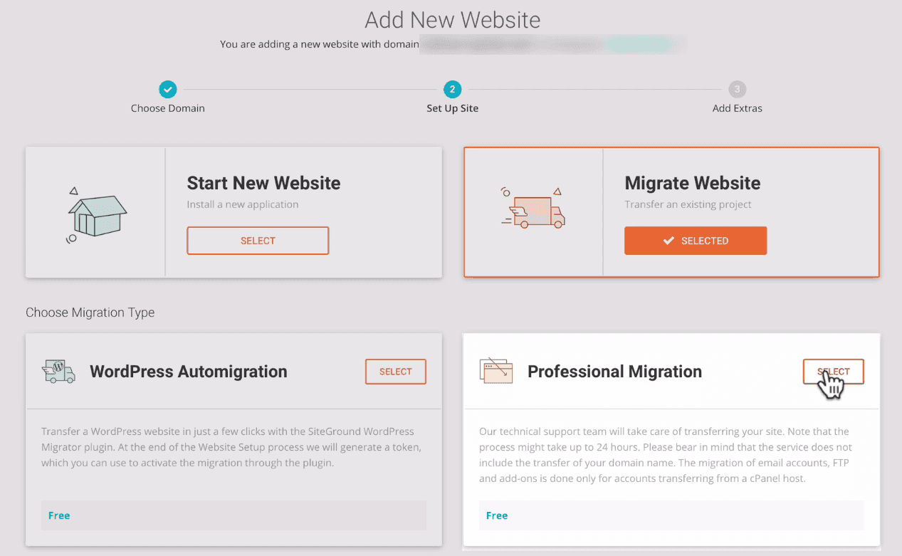 第二種則是透過 SiteGround 專業的客服專家,讓他們直接幫你進行遷移操作。由於 SiteGround 的人員不僅專業,且每一位的回覆速度都相當快速,同時這項服務是免費的。因此,這裡我會建議你直接採用「Professional Migration」,讓 SiteGround 的專家幫你進行網站遷移。