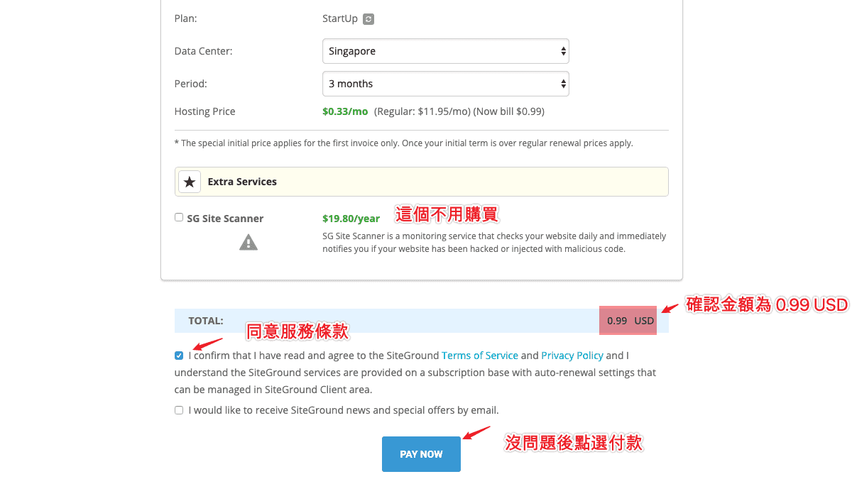 最後,在 Total 地方會顯示最終價格,請確認該價格為 $0.99 美元。沒問題的話,將下方的「I confirm that I have read and agree to the SiteGround Terms of Service and Privacy Policy and I understand the SiteGround services are provided on a subscription base with auto-renewal settings that can be managed in SiteGround Client area.」打勾。另外一項「I would like to receive SiteGround news and special offers by email.」則看你想不想收到來自 SiteGround 的新聞與促銷 Email,可勾可不勾。完成後點選下方「Pay Now」按鈕進行付款。
