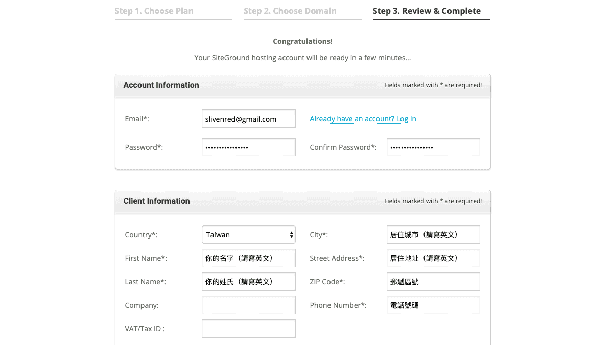 最後在付款頁面,你需要在此頁面中輸入將來登入 SiteGround 的帳號密碼、基本資料,以及信用卡付款資訊。
