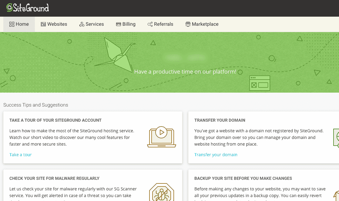 主機設定好之後,我們就可以登入 SiteGround 後台,準備開始安裝 WordPress 網站拉!由於 SiteGround 在 2019 年推出新的後台管理系統,因此,你現在進入 SiteGround 後台後,會看到新版首頁。