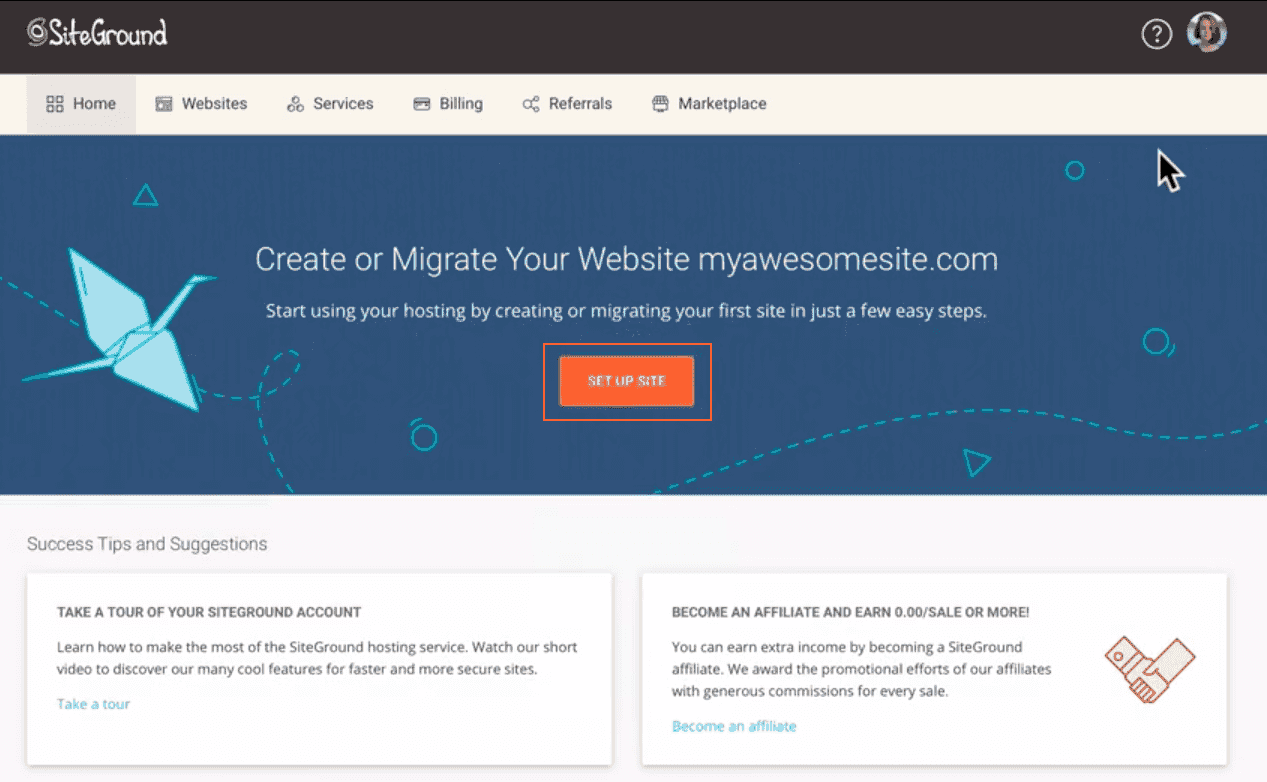 若你是剛購買後登入,就會看到畫面中間有一個「SET UP SITE」的按鈕,點選後就能立即帶領你建立新的 WordPress 網站,或是從其他地方搬家過來。