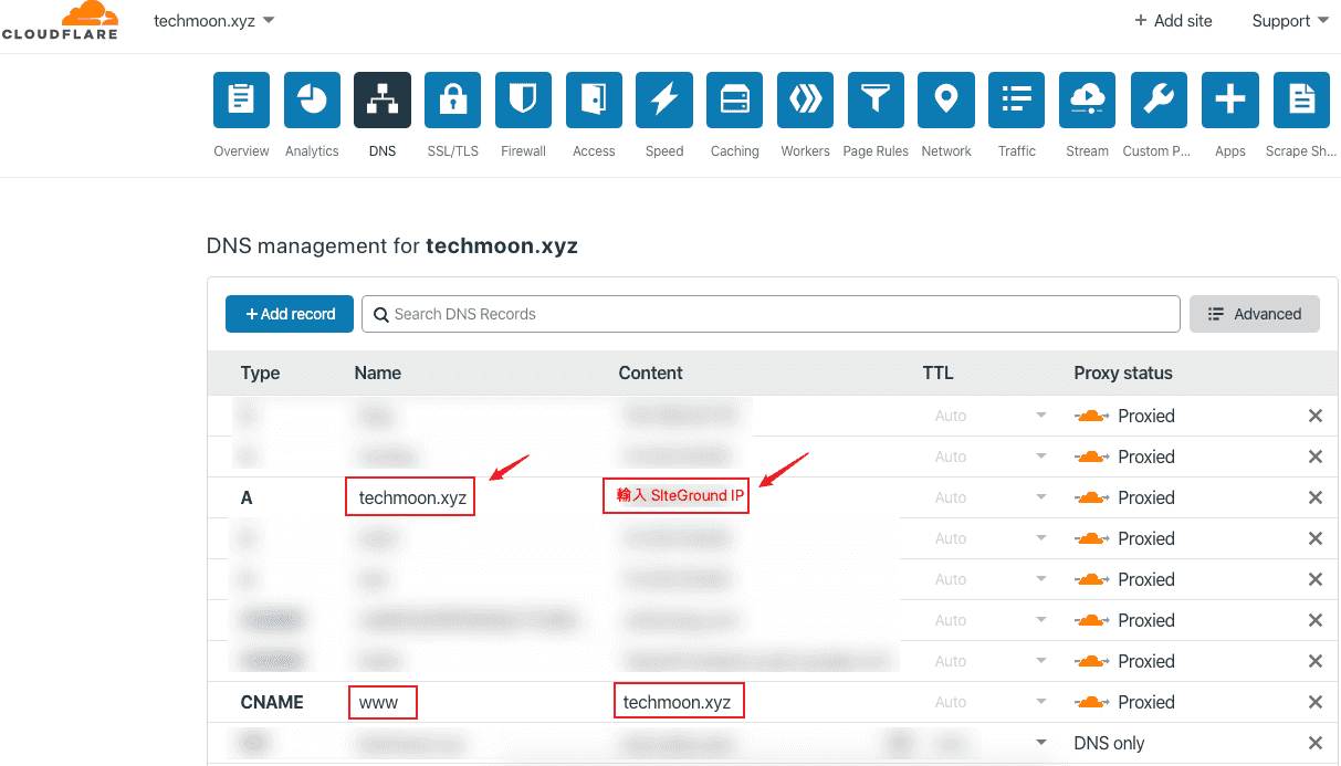 前往 Cloudflare > DNS,在 A 紀錄當中,將你的網域指向至 SiteGround 的 IP 位置。