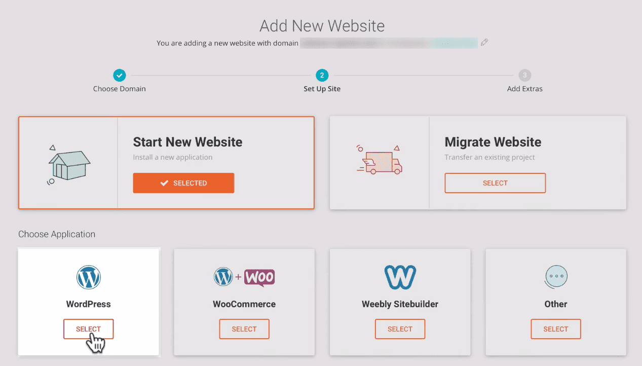 下一步就是選擇「Start New Website」或是「Migrate Website」。如果你是剛開始建立網站,而非從其他地方搬家到 SiteGround 主機,那麼就點選「Start New Website」。點選後,下方就會出現許多內容管理系統讓你進行挑選。