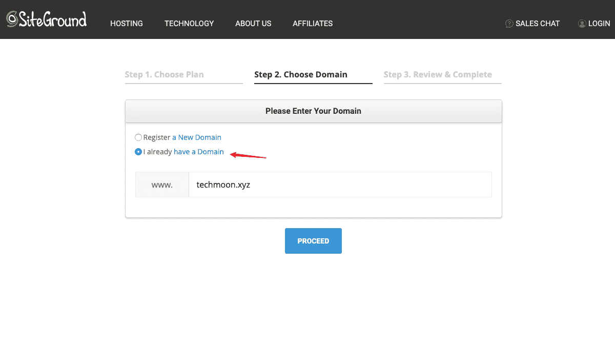 如果你本身有網域名稱的話,直接點選下方的「I already have a Domain」選項,輸入你的網域即可。如果你沒有網域名稱,那麼建議你先前往這篇網域購買教學,自行購買。由於在 SiteGround 當中所提供的網域購買價格並不便宜,因此較經濟的做法是到其他地方購買便宜網域,後續再將 DNS 紀錄指向至 SiteGround 即可。輸入完成後,點選「PROCEED」即可進入下一步。