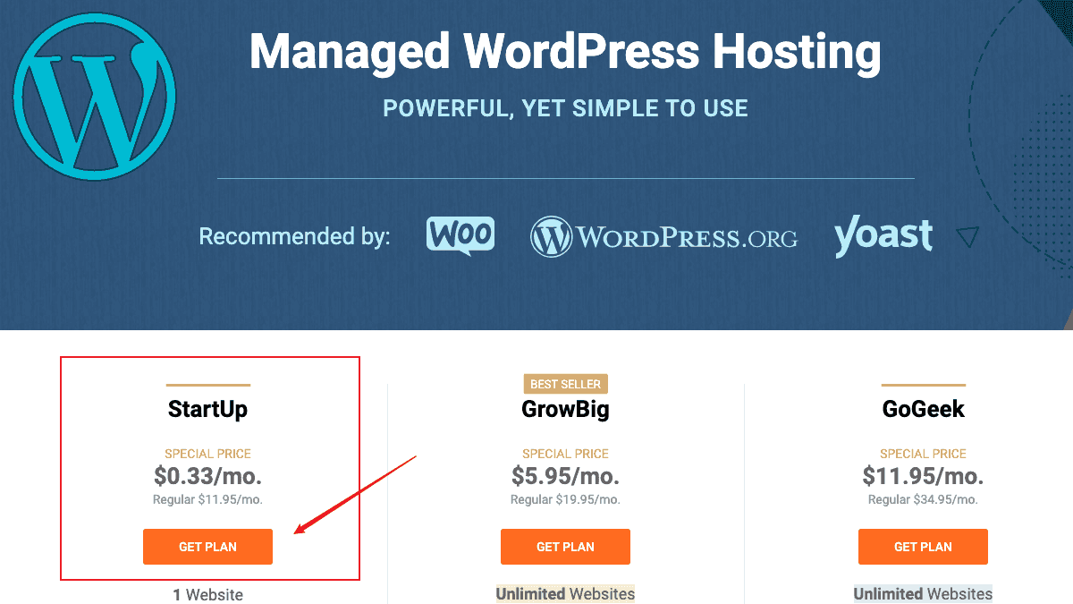 透過我們的 SiteGround 推薦連結前往網站,你將會看到「StartUp」方案從原本的「$3.95 美元」變成特惠的「$0.99 美元」。點選「GET PLAN」即可進行下一步。
