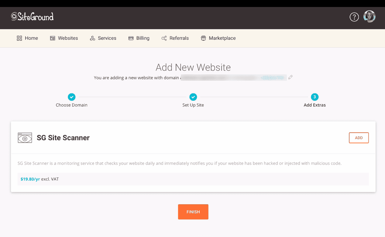 最後一步是 SiteGround 的加值服務「SG Site Scanner」,其功用在於全天候監控你的網站,使你的網站在被攻擊、注入惡意程式碼的時候,能夠隨時掃描並通知你。這項加值功能就看個人有沒有需求,我個人是不建議購買。