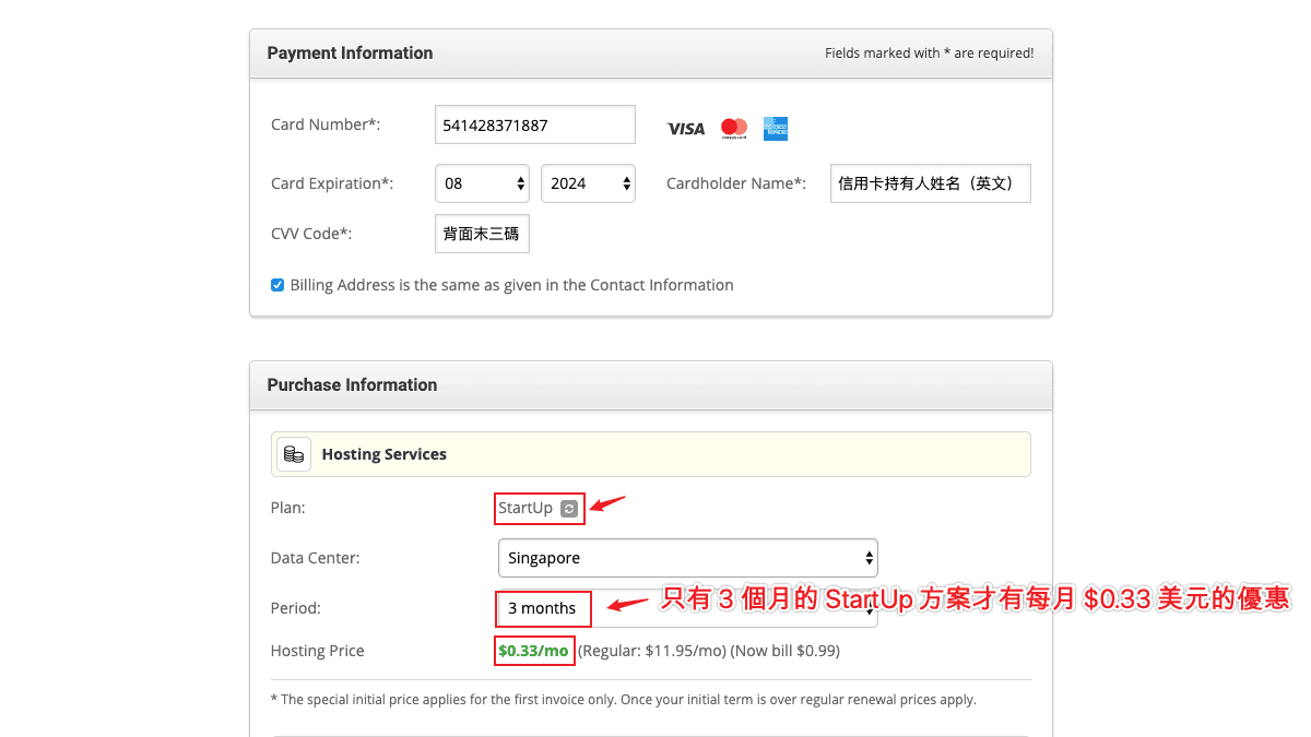 在信用卡付款資訊下方,你可以再次確認所選擇的主機方案、資料中心位置、主機租賃時間、主機費用…等等資訊。請確保你是選擇「StartUp」方案,且期間為 3 個月,價格每月是 $0.33 美元,總共費用是 $0.99 美元。資料中心的位置視你的需求而定,若你的目標客群在美國,那就選擇「USA」;若你的目標客群主要在亞洲,那就選擇「Singapore」。