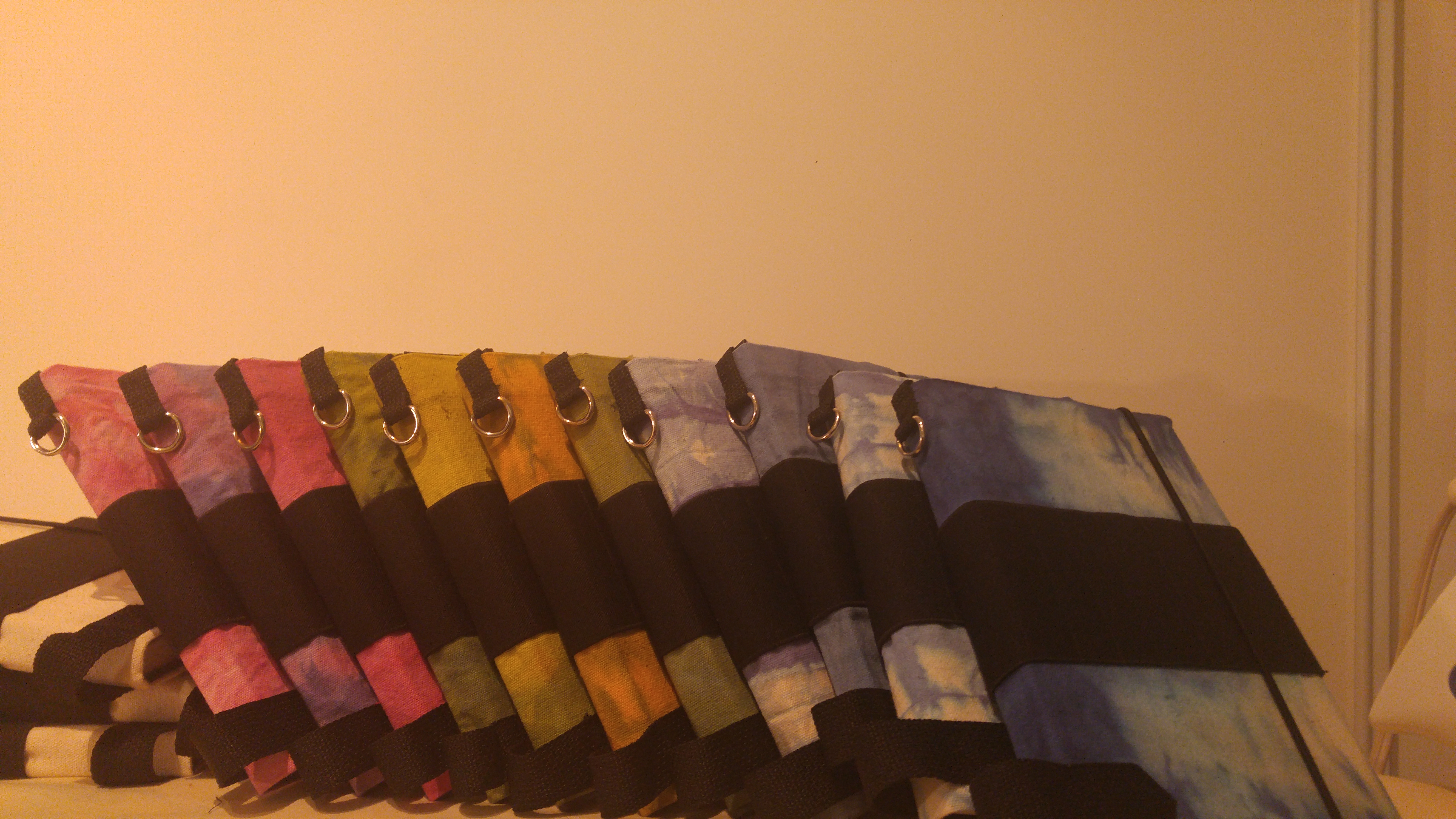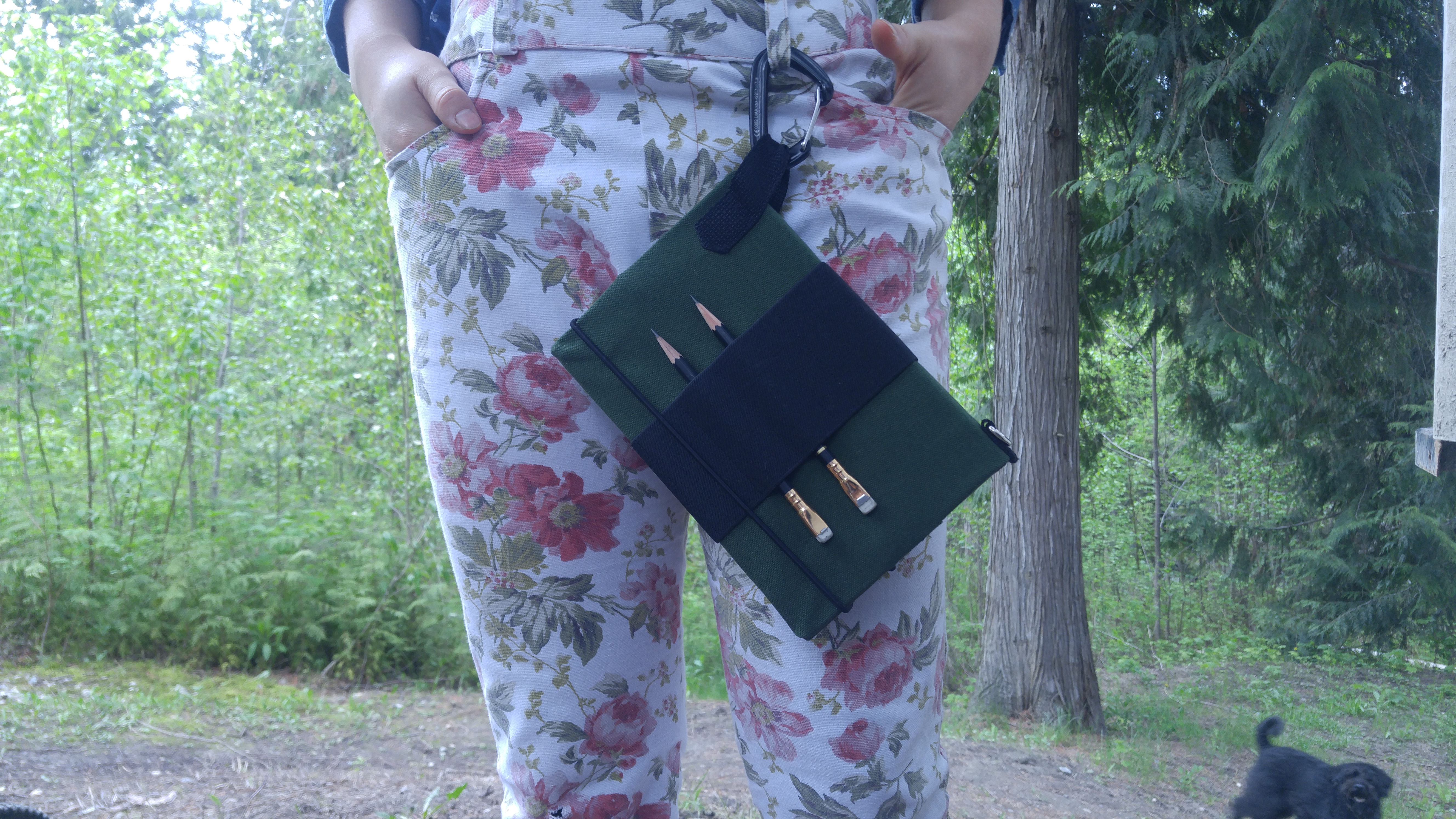 It is typically made of canvas, and twill tape, and elastics, but sometimes recycled leather and weird fabrics get involved. It's designed to fit over a standard 5.5"x8.5" sketchbook or journal. It is designed to carry any gear: pencils, pens, brushes, watercolor palette, cell phone, cards, money, pocketknife. It’s also designed to be fitted with carabiners to clip to your belt loops, backpack, luggage or shoulder strap. Hyper-portable. Ultra-customizable. If anyone is interested in making them, I can send you my detailed illustrated instructions. I would love to see others makers on other spots of this earthplanet collaborate on this concept.