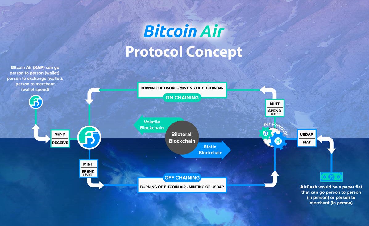 Bitcoin Air will start with a limited circulating supply that will vary based on the minting and burning of coins through the Air Protocol. Two bilaterally operating chains will be interacting with each other through consensus nodes that will come to an agreement on whether or not the burn/mint process can be pushed while ensuring a number of factors are in line before validating it on the network. This action, called off chaining, will occur by a consumer using the “spend” protocol or “swap” protocol initiating a burn of supply, and an immediate minting of exact USDAP on the side chain. This side chain will maintain a static value based on the amount of USDAP available through the off chaining process. The circulating supply of Bitcoin Air will lower along with the available market cap, maintaining the value of each share on the volatile chain. This will allow merchants and small businesses to “side chain” their value if they would prefer not to fall victim to market health.
