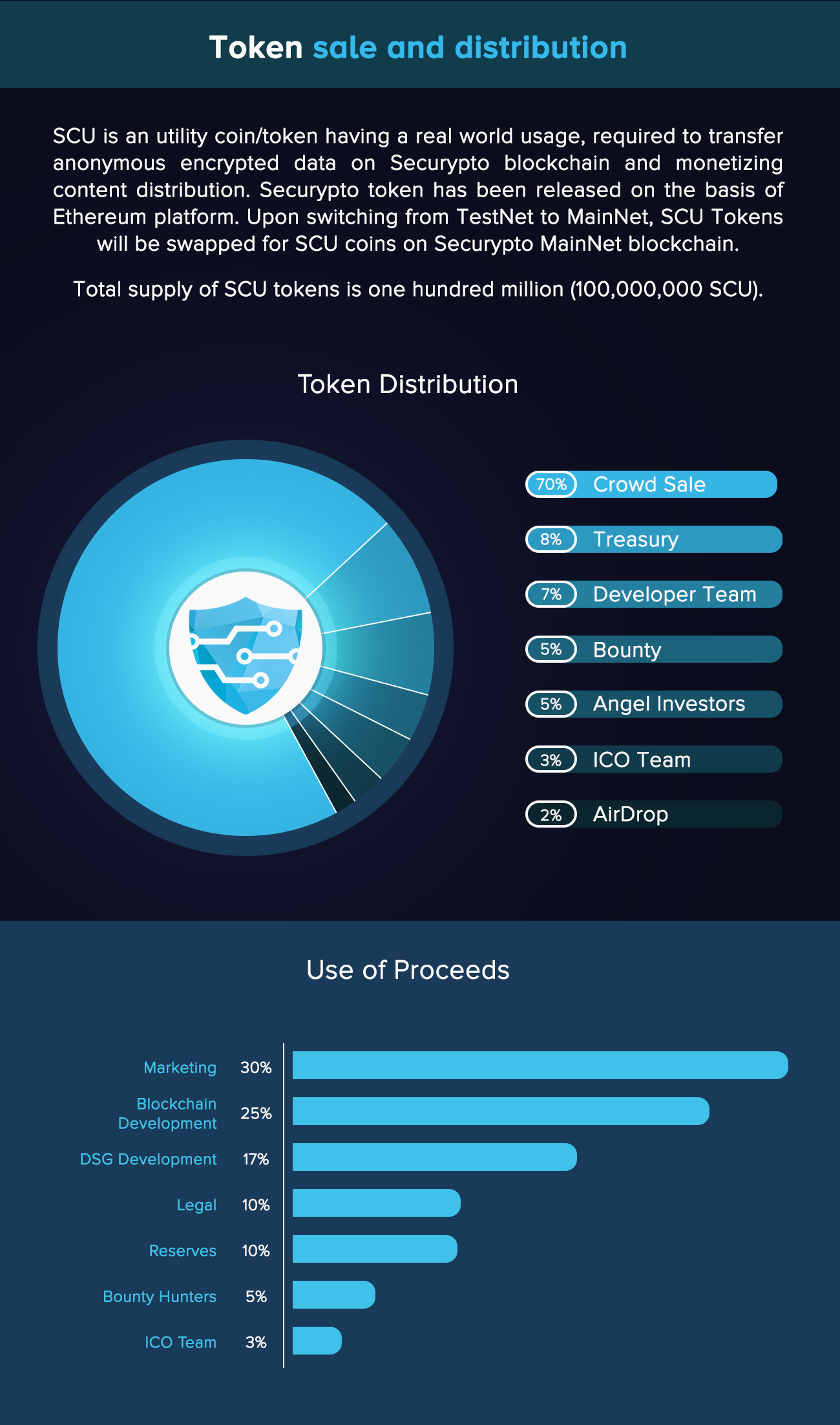 SCU is an utility coin/token having a real world usage, required to transfer anonymous encrypted data on Securypto blockchain and monetizing content distribution. Securypto token has been released on the basis of Ethereum platform. Upon switching from TestNet to MainNet, SCU Tokens will be swapped for SCU coins on Securypto MainNet blockchain. Total supply of SCU tokens is one hundred million (100,000,000)