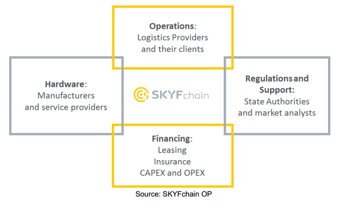 SKYFchain also has supports sections and also the complementary parties. consist of 4 blocks to sustain the SKYFchain business model. first is Operation that encompasses logistic providers to their clients. SKYFChain provides the registered logistic providers that appoint the drone's direction to their clients, second regulation: state authorities and market analysts describe the authorities are allowing the freight robotic drone is allowed. mostly the regulation agrees and see it as the revolution and being part of future. financing: Leasing, Insurance, Capex, and Opex . as we know everything to grow up need fund assistance that often provided by leasing. and the last Hardware: Manufactures and service providers are the physical support that has to fulfill to do the activity . it was formed in drone and unnamed copter