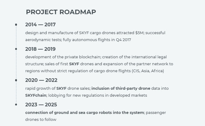 SKYFchain is the first operational platform based on B2R block circuits, applicable globally in all sectors of the developing freight robotics industry with an initial focus on debunking the industry of unmanned aerial vehicles. SKYFchain is unique in that it will be designed to exclude a person as an intermediary, and he will have access to confirmed customers of the first industrial heavy cargo buzz - a SKYF whistle that already flies. Technically, the main goal of SKYFchain is to integrate important information for all market participants and organize the execution of smart contracts for transactions. The most important advantages will be scoring and open access to financing the production and maintenance of unmanned aerial vehicles and reducing the cost of insurance for unmanned aircraft.