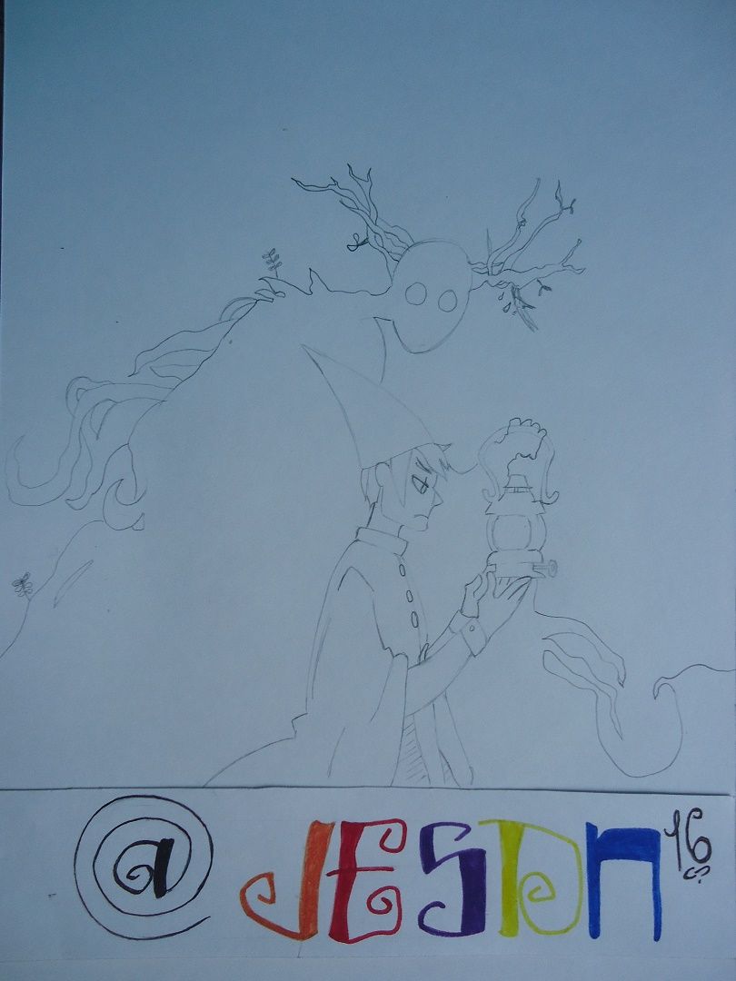 La bestia no podía faltar, así que la dibuje detrás de Wirt sosteniendo la lámpara debido a que mientras esta permanezca encendida el vivirá.