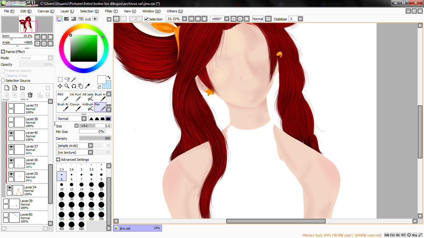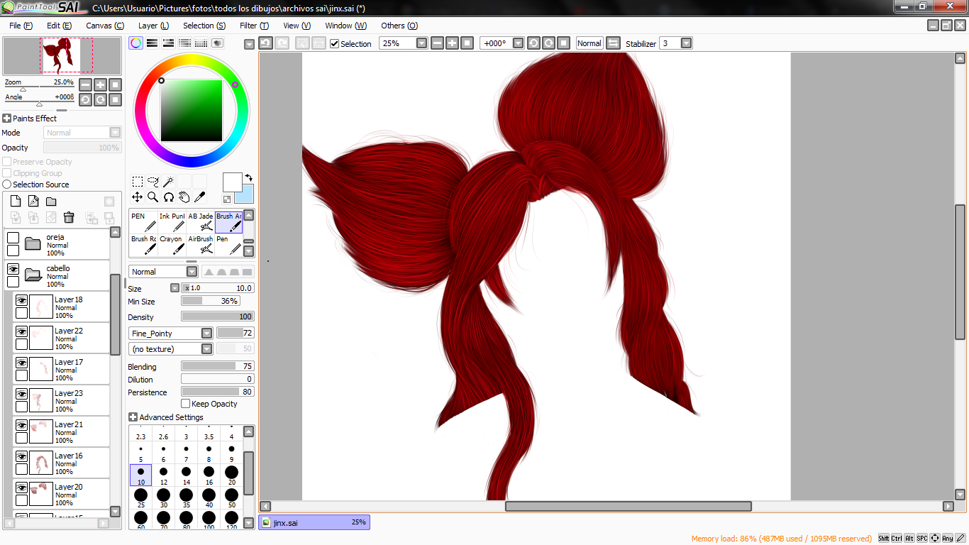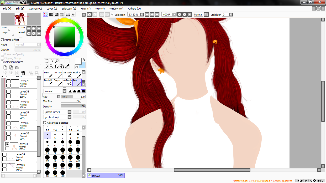 lo primero que hice luego de tener el boceto, fue el cabello, esta vez tome como referencia varias imagenes tanto del personaje dentro del juego como de una cosplayer llamada glory para ver bien el color del cabello.