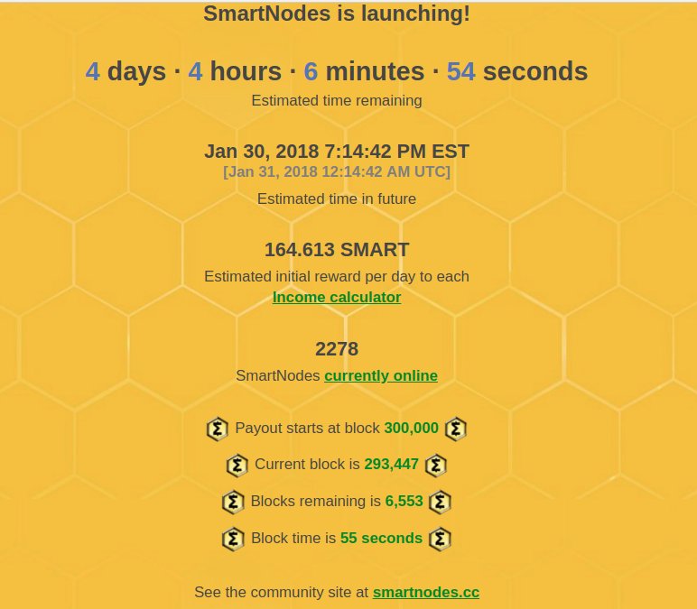El 11 de enero se lanzo la versión 1.1.0 de la wallet de smartcash con soporte para masternodes, desde ese momento ya podías montar tu smartnode, pero oh sorpresa los rewards se iniciaban en el bloque 300000, desde ese momento inicio la cuenta regresiva para tan anhelado bloque, al momento de escribir este post el bloque actual es de 293264 esto quiere decir que aproximadamente el próximo 31 de enero después de las 12:14 AM en horario UTC se estaría llegando al bloque 300000.