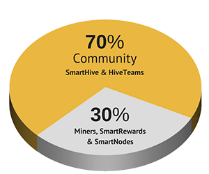 SmartCash is a community-centric cryptocurrency, where community and development comes first. 70% of the block reward has been allocated to fund SmartHive community proposals as well as the Hive Teams. 30% of the remaining block reward has been allocated to Mining (5%) and SmartRewards (15%) and SmartNodes (10%).