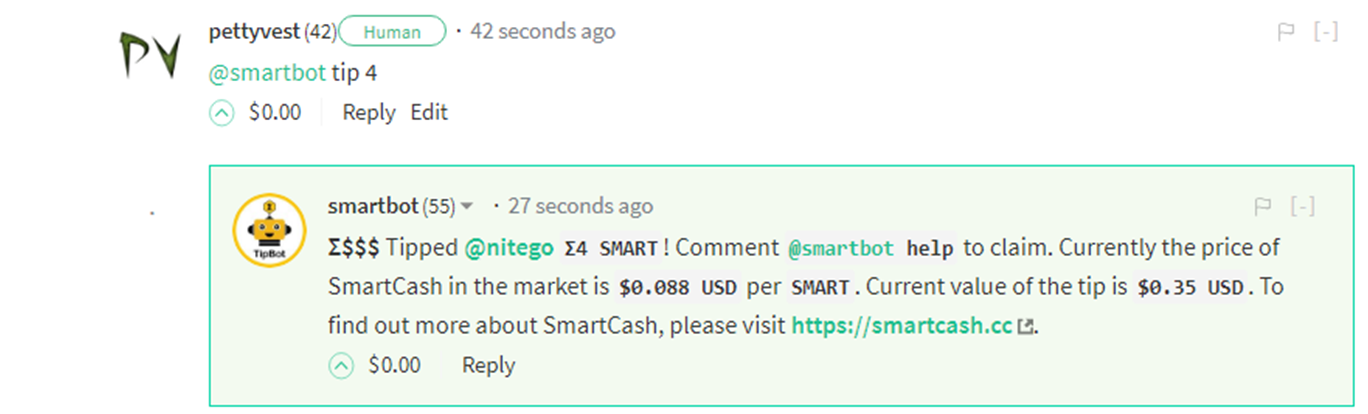 Σ30 SMART! Comment@smartbot helpto claim. Currently the price of SmartCash in the market is$0.068 USDperSMART. Current value of the tip is$2.04 USD. To find out more about SmartCash, please visit https://smartcash.cc.balance