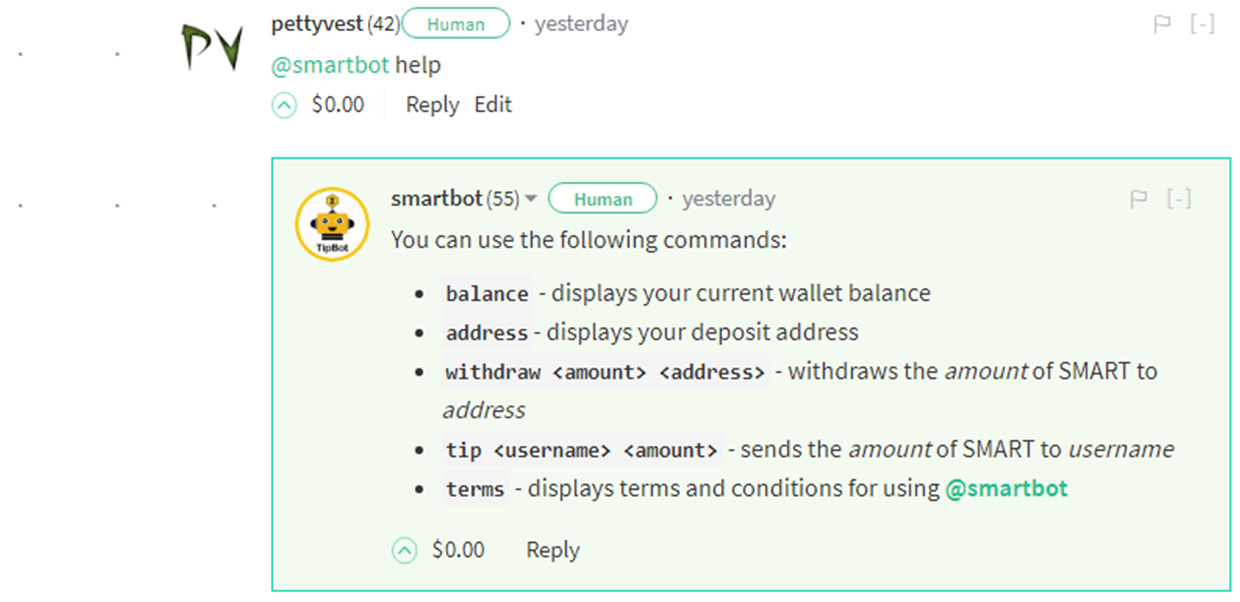 Smartcash offers the convenience of tipping users and creators of content on Steemit by making use of the TipBot (@smartbot) on Steemit. Let me walk you through the command prompts of the TipBot. SmartCash is a great way to earn extra reward on the Steem Blockchaine based platforms and an amazing community that work together. I recommend following both @smartcash and @smartbot on Steemit for regular updates regarding SmartCash community developments on Steemit.