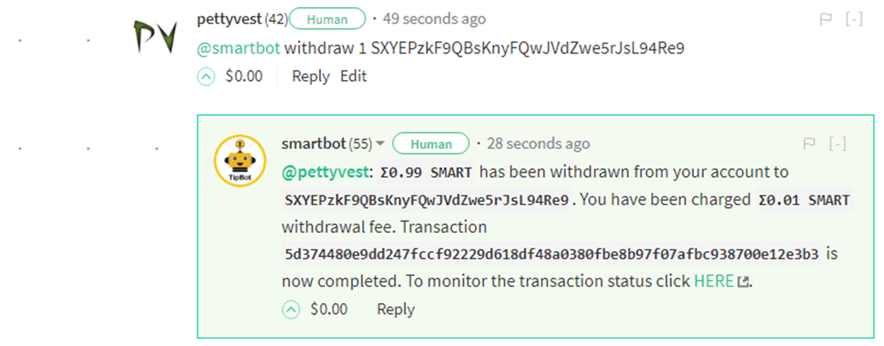 _@smartbot withdraw 1(amount) SXYEPzkF9QBsKnyFQwJVdZwe5rJsL94Re9(address)